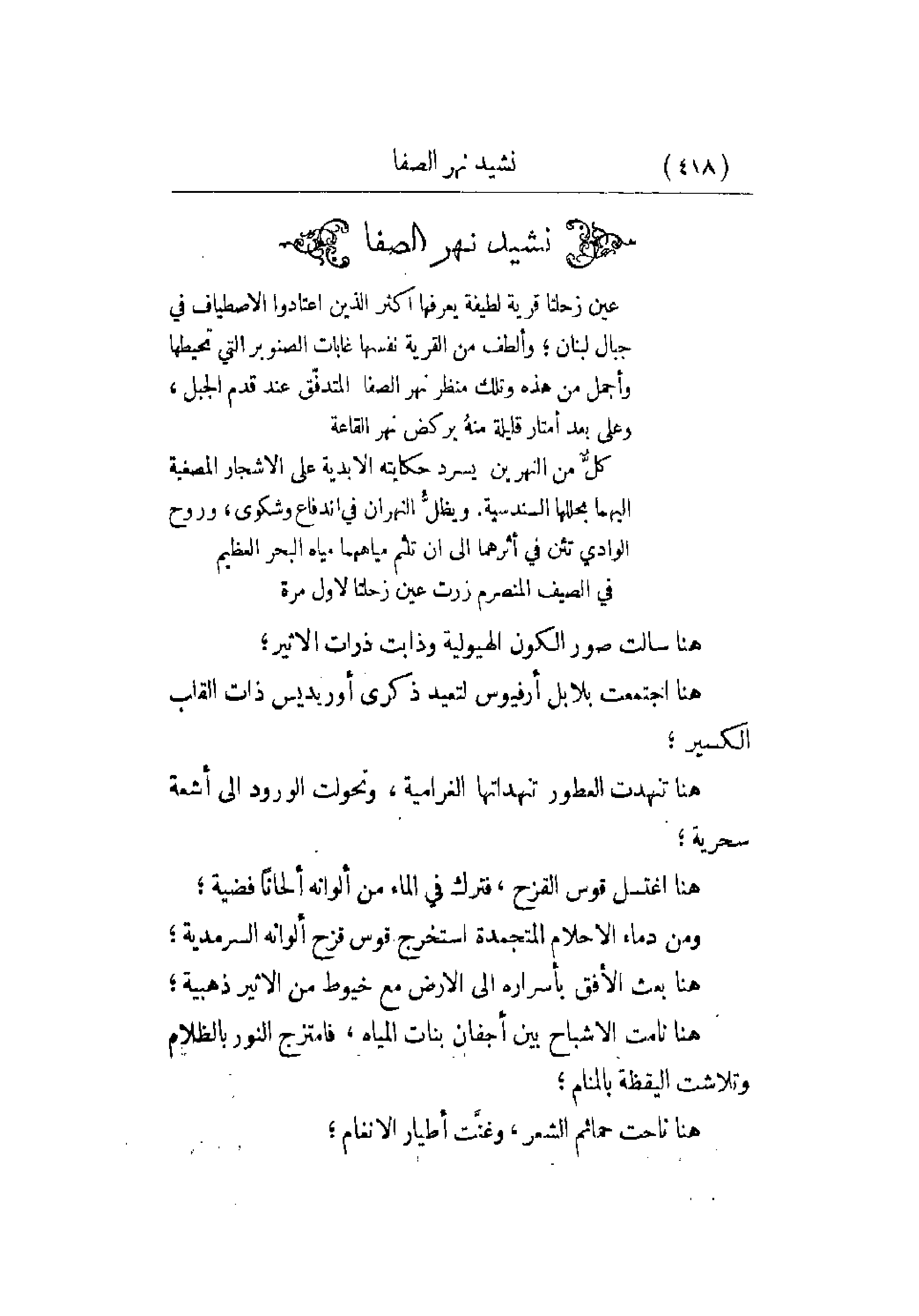 عين زحلتا قرية لطيفة يعرفها أكثر الذين اعتادوا الاصطياف في جبال لبنان؛ وألطف من القرية نفسها غابات الصنوبر التي تحيطها وأجمل من هذه وتلك منظر نهر الصفا المتدفّق عند قدم الجبل , وعلى بعد أمتار قليلة منهُ يركض نهر القاعة. كلٌّ من النهرين يسرد حكايته الأبدية على الأشجار المصغية إليهما بحللها السندسية. ويظلُّ النهران في اندفاع وشكوى , وروح الوادي تئن في أثرهما إلى أن تائم مياههما مياه البحر العظيم في الصيف المنصرم زرت عين زحلتا لأول مرة.