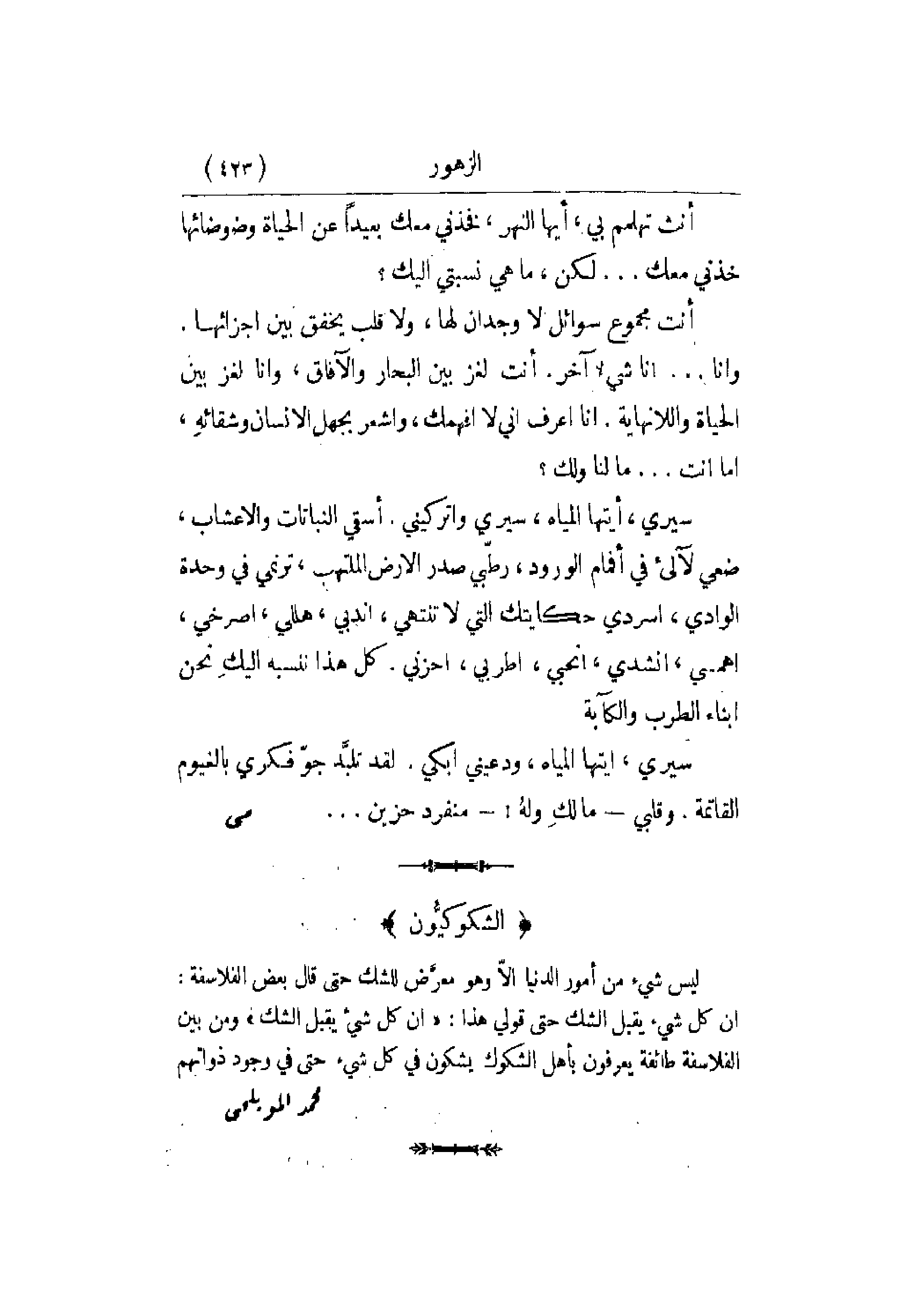 أنت تهلمم بي , أيها النهر , فخذني معك بعيداً عن الحياة وضوضائها خذني معك. . . لكن , ما هي نسبتي إليك؟