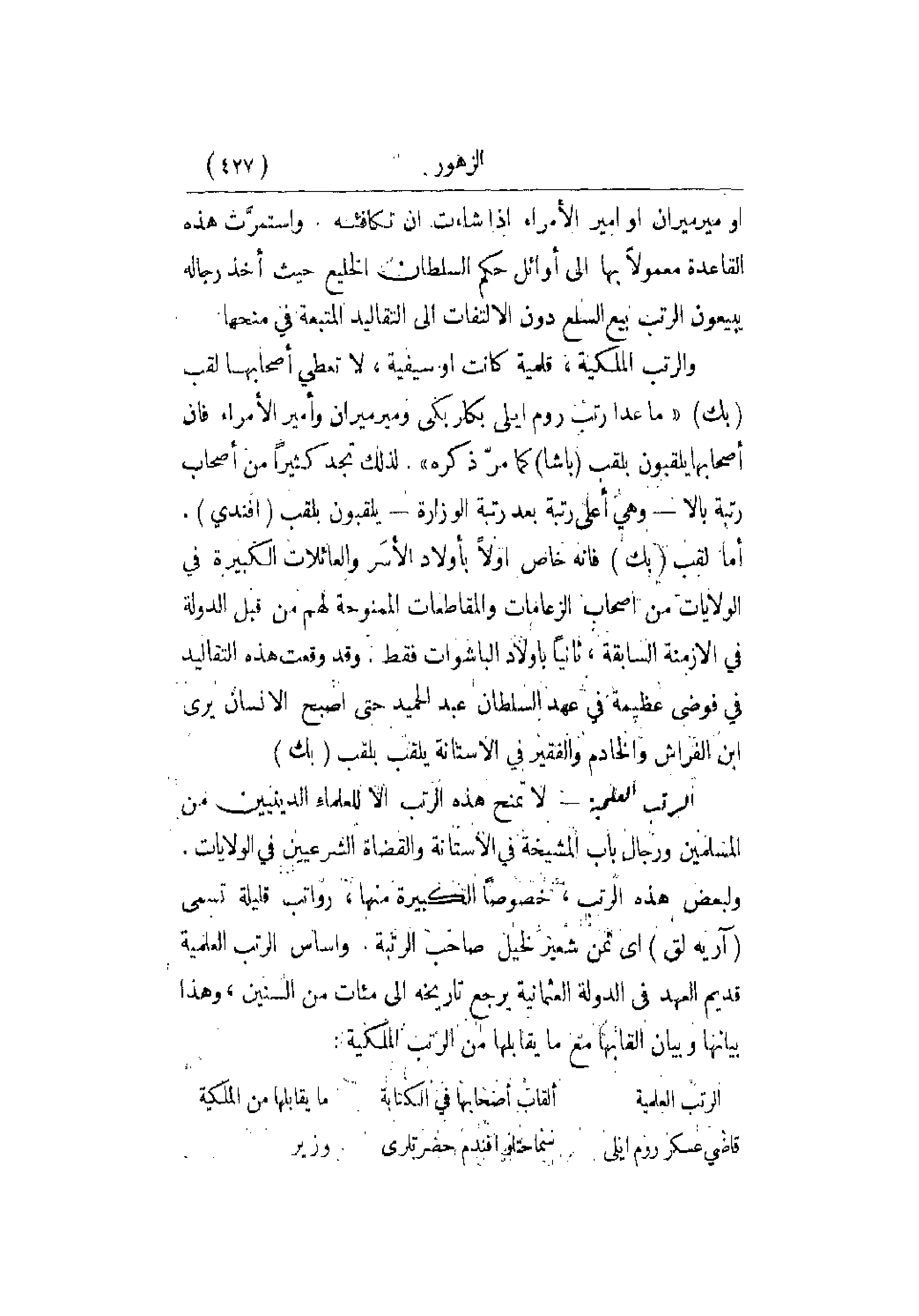 تكافئه. واستمرَّت هذه القاعدة معمولاً بها إلى أوائل حكم السلطان الخليع حيث أخذ رجاله يبيعون الرتب بيع السلع دون الالتفات إلى التقاليد المتبعة في منحها. والرتب الملكية , قلمية كانت أو سيفية , لا تعطي أصحابها لقب بك ماعدا رتب روم ايلي بكلركي وميرميران وأمير الأمراء فإن أصحابها يلقبون بلقب باشا كما مرّ ذكره لذلك تجد كثيراً من أصحاب رتبة بالا - وهي أعلى رتبة بعد رتبة الوزارة - يلقبون بلقب أفندي أما لقب بك فإنه خاص أولاً بأولاد الأسَر والعائلات الكبيرة في الولايات من أصحاب الزعامات والمقاطعات الممنوحة لهم من قبل الدولة في الأزمنة السابقة , ثانياً بأولاد الباشوات فقط. وقد وقعت هذه التقاليد في فوضى عظيمة في عهد السلطان عبد الحميد حتى أصبح الإنسان يرى ابن الفراش والخادم والفقير في الآستانة يلقب بك.