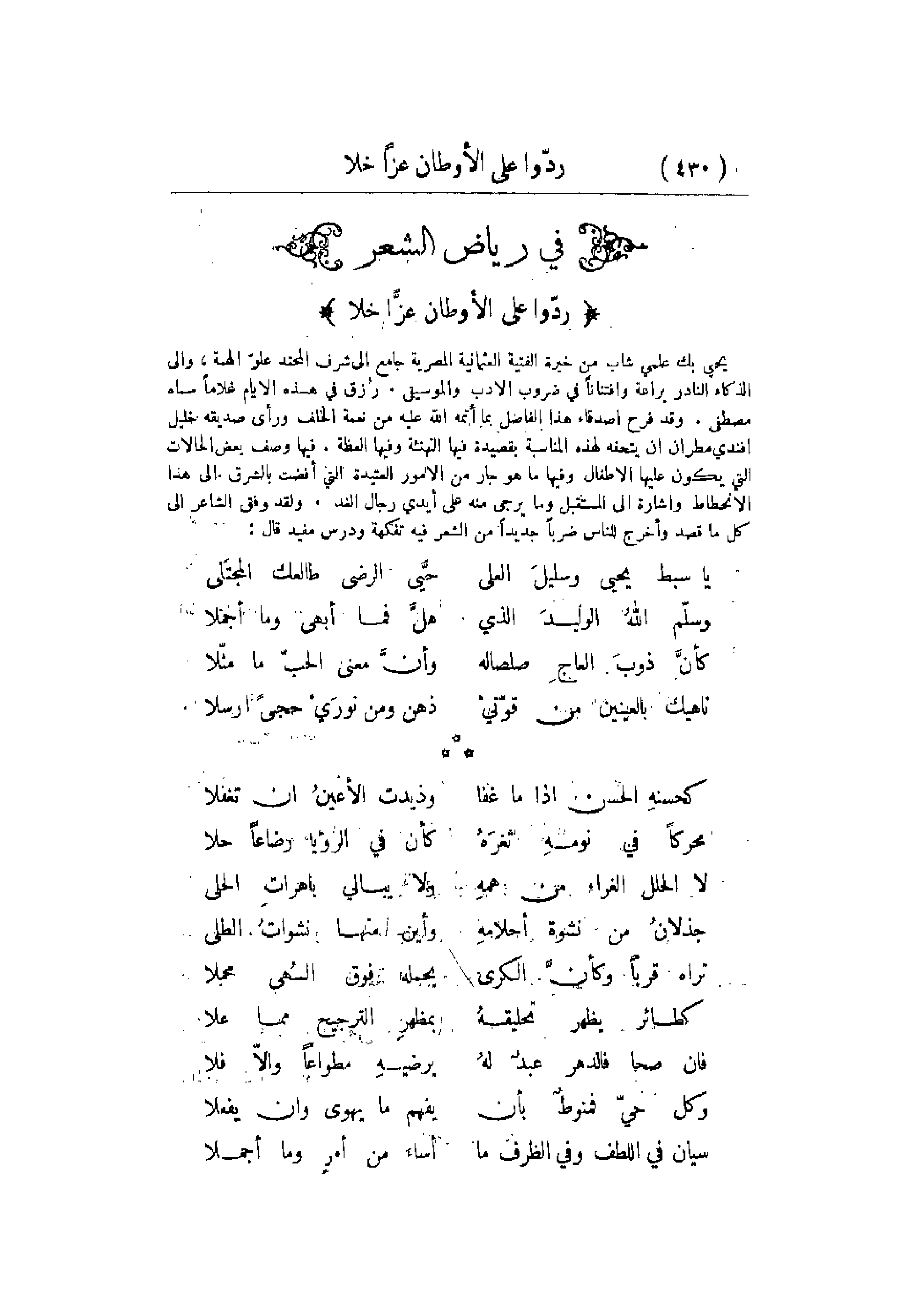 يحيي بك علمي شاب خبرة الفتية العثمانية المصرية جامع إلى شرف المحتد علوّ الهمة , وإلى الذكاء النادر براعة وافتناناً في ضروب الأدب والموسيقى. رزق في هذه الأيام غلاماً سماه مصطفى. وقد فرح أصدقاء هذا الفاضل بما أتمه الله عليه من نعمة الخلف ورأى صديقه خليل أفندي مطران أن يتحفه لهذا المناسبة بقصيدة فيها التهنئة وفيها العظة. فيها وصف بعض الحالات التي يكون عليها الأطفال وفيها ما هو جار من الأمور العتيدة التي أفضت بالشرق إلى هذا الانحطاط وإشارة إلى المستقبل وما يرجى منه على أيدي رجال الغد. ولقد وفق الشاعر إلى كل ما قصد وأخرج للناس ضرباً جديداً من الشعر فيه تفكهه ودرس مفيد قال: