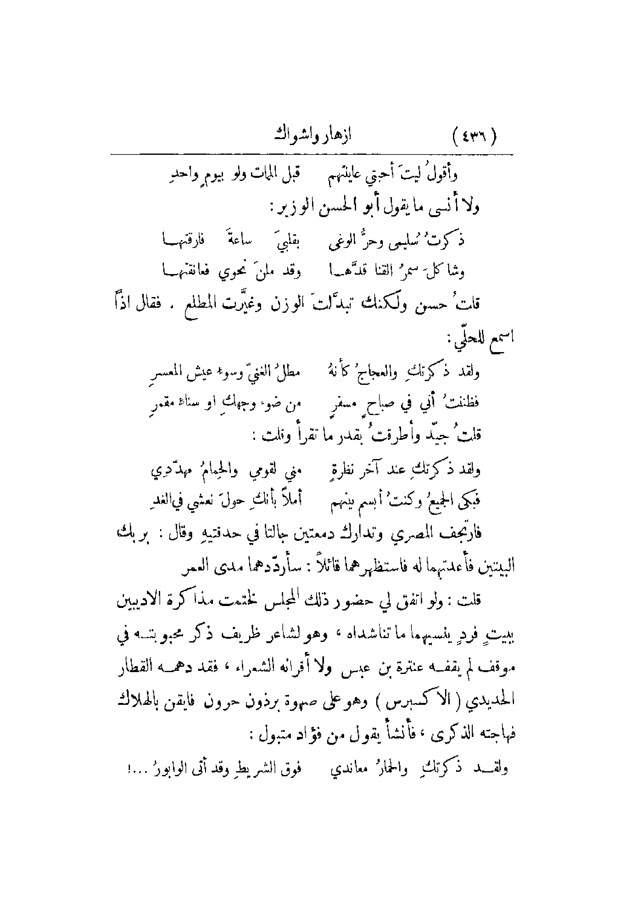 فارتجف المصري وتدارك دمعتين جالتا في حدقتيهِ وقال: بربك البيتين فأعدتهما له فاستظهرهما قائلاً: سأردّدهما مدى العمر. قلت: ولو انفق لي حضور ذلك المجلس لختمت مذاكرة الأديبين ببيتٍ فردِ ينسيهما ما تناشداه , وهو لشاعر ظريف ذكر محبوبته في موقف لم يقفه عنترة بن عبس ولا أقرانه الشعراء , فقد دهمه القطار الحديدي الإكسبرس وهو على صهوة برذون حرون فأيقن بالهلاك فهاجته الذكرى , فأنشأ يقول من فؤاد متبول: