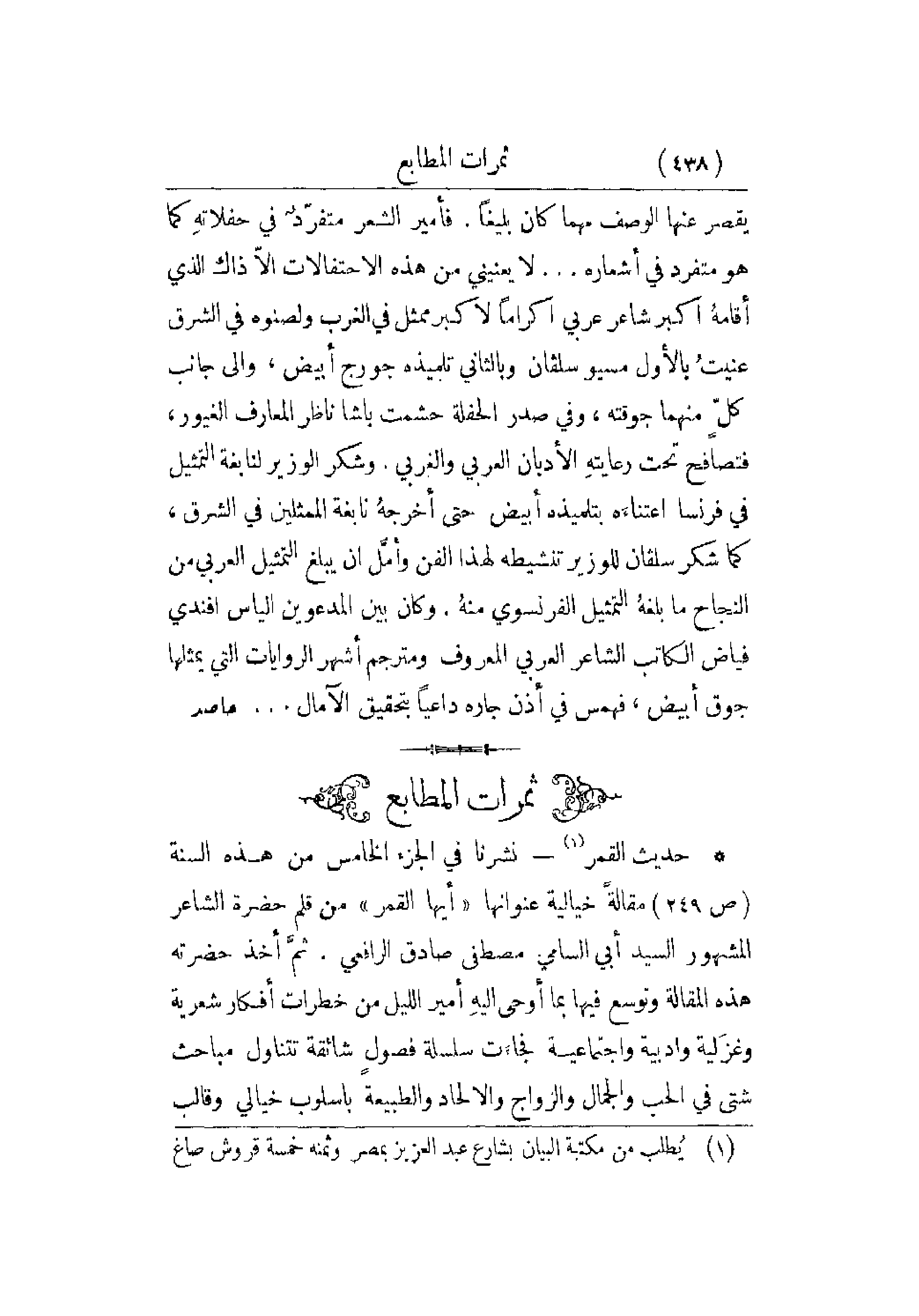 يقتصر عنها الوصف مهما كان بليغاً. فأمير الشعر متفرّدٌ في حفلاتهِ كما هو متفرد في أشعاره. . . لا يعنيني من هذه الاحتفالات إلاّ ذاك الذي أقامهُ أكبر شاعر عربي إكراماً لأكبر ممثل في الغرب ولصنوه في الشرق عنيتُ بالأول مسيو سلفان وبالثاني تلميذه جورج أبيض , وإلى جانب كلٍّ منهما جوقته , وفي صدر الحفلة حشمت باشا ناظر المعارف الغيور , فتصافح تحت رعايتهِ الأدبان العربي والغربي. وشكر الوزير لنابغة التمثيل في فرنسا اعتناءَه بتلميذه أبيض حتى أخرجهُ نابغة الممثلين في الشرق , كما شكر سلفان للوزير تنشيطه لهذا الفن وأمَّل أن يبلغ التمثيل العربي من النجاح ما بلغهُ التمثيل الفرنسوي منه. وكان بين المدعوين إلياس أفندي فياض الكاتب الشاعر العربي