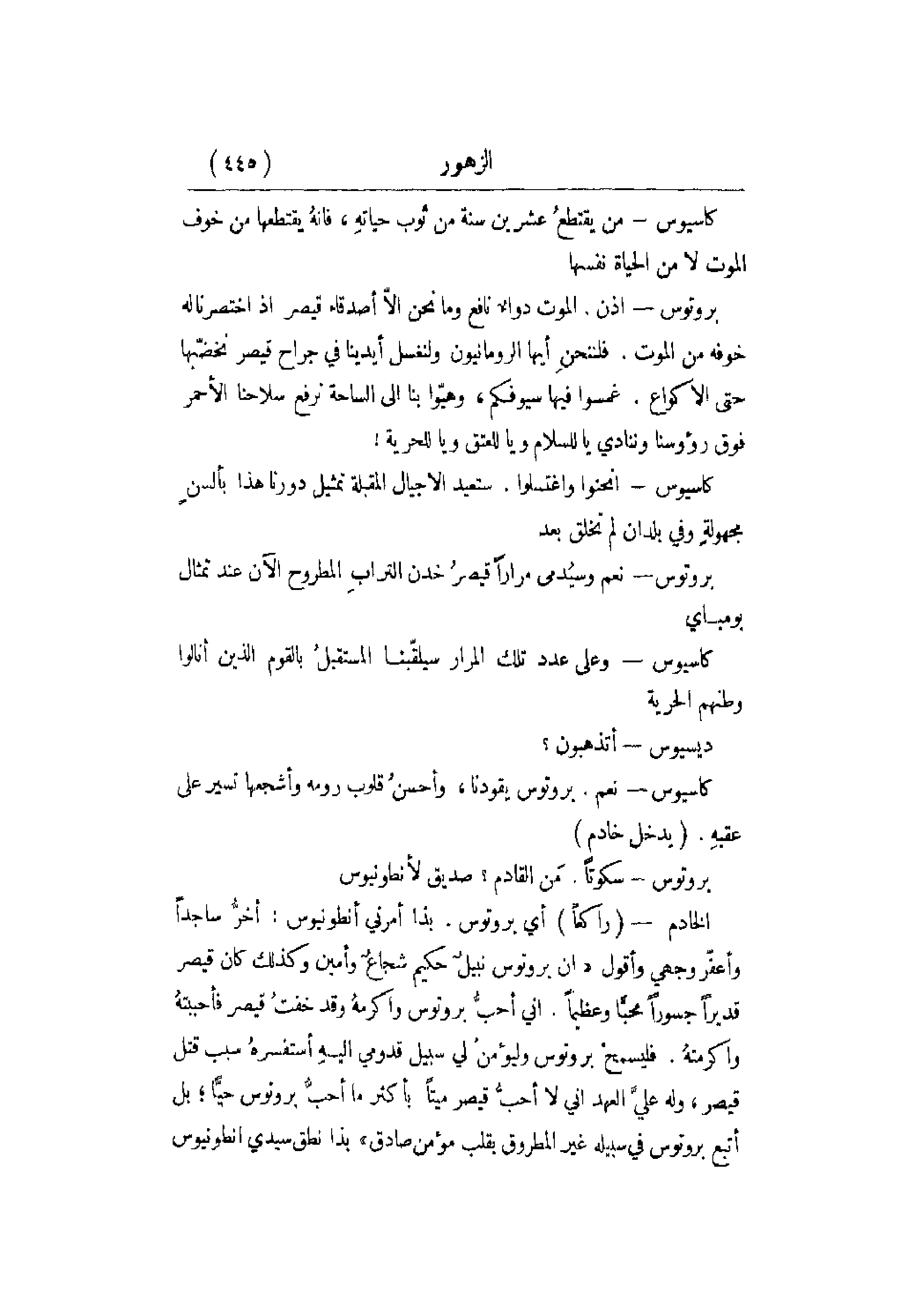 الخادم - راكعاً أي بروتوس. بذا أمرني أنطونيوس: أخرُّ ساجداً وأعفّر وجهي وأقول إن بروتوس نبيلٌ حكيم شجاعٌ وأمين وكذلك كان قيصر قديراً جسوراً محبّاً وعظيماً. إني أحبُّ
