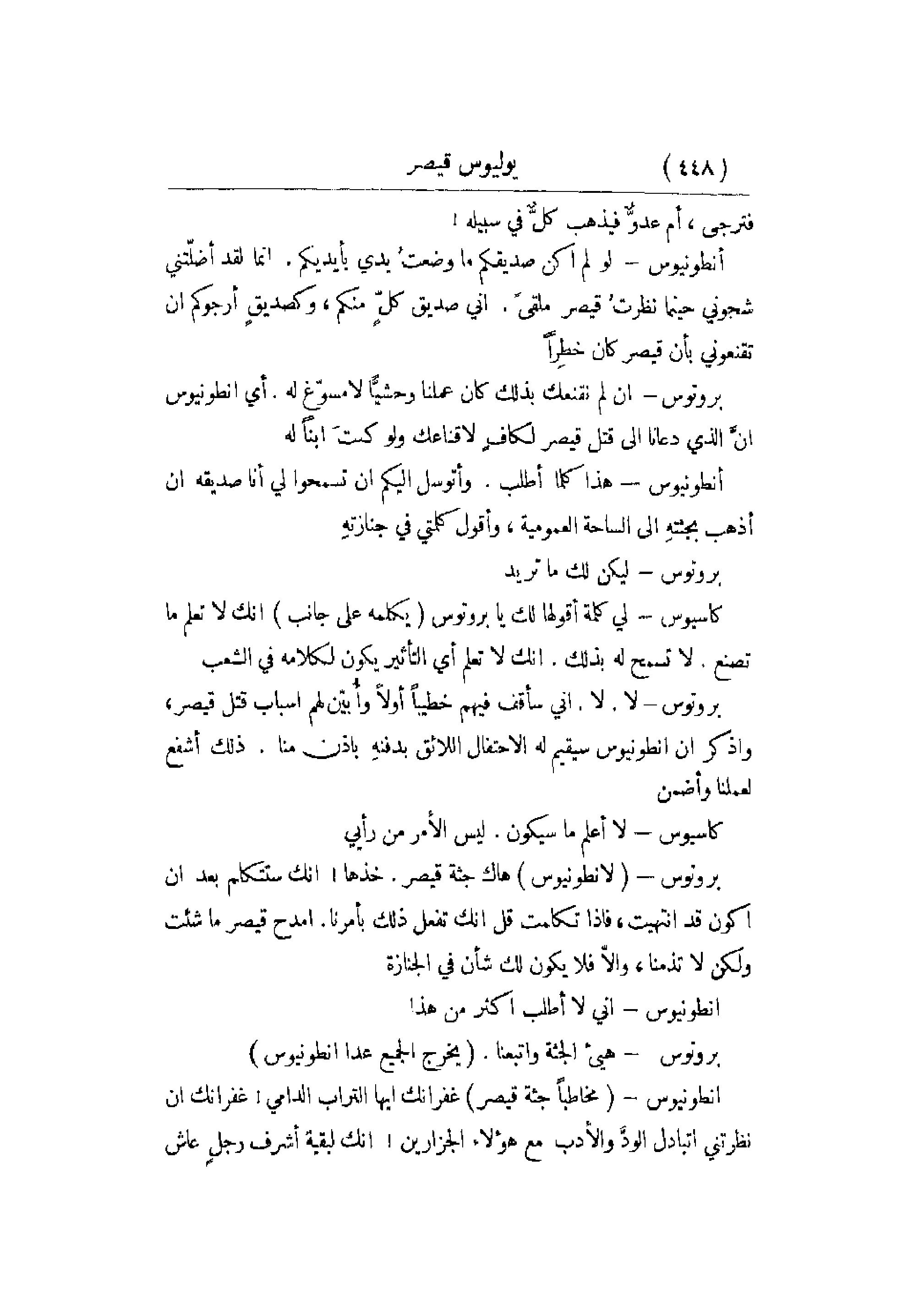 بروتوس - إن لم نقنعك بذلك كان عملنا وحشيّاً لا مسوّغ له. أي أنطونيوس أنَّ الذي دعانا إلى قتل قيصر لكافٍ لإقناعك ولو كنتَ ابناً له