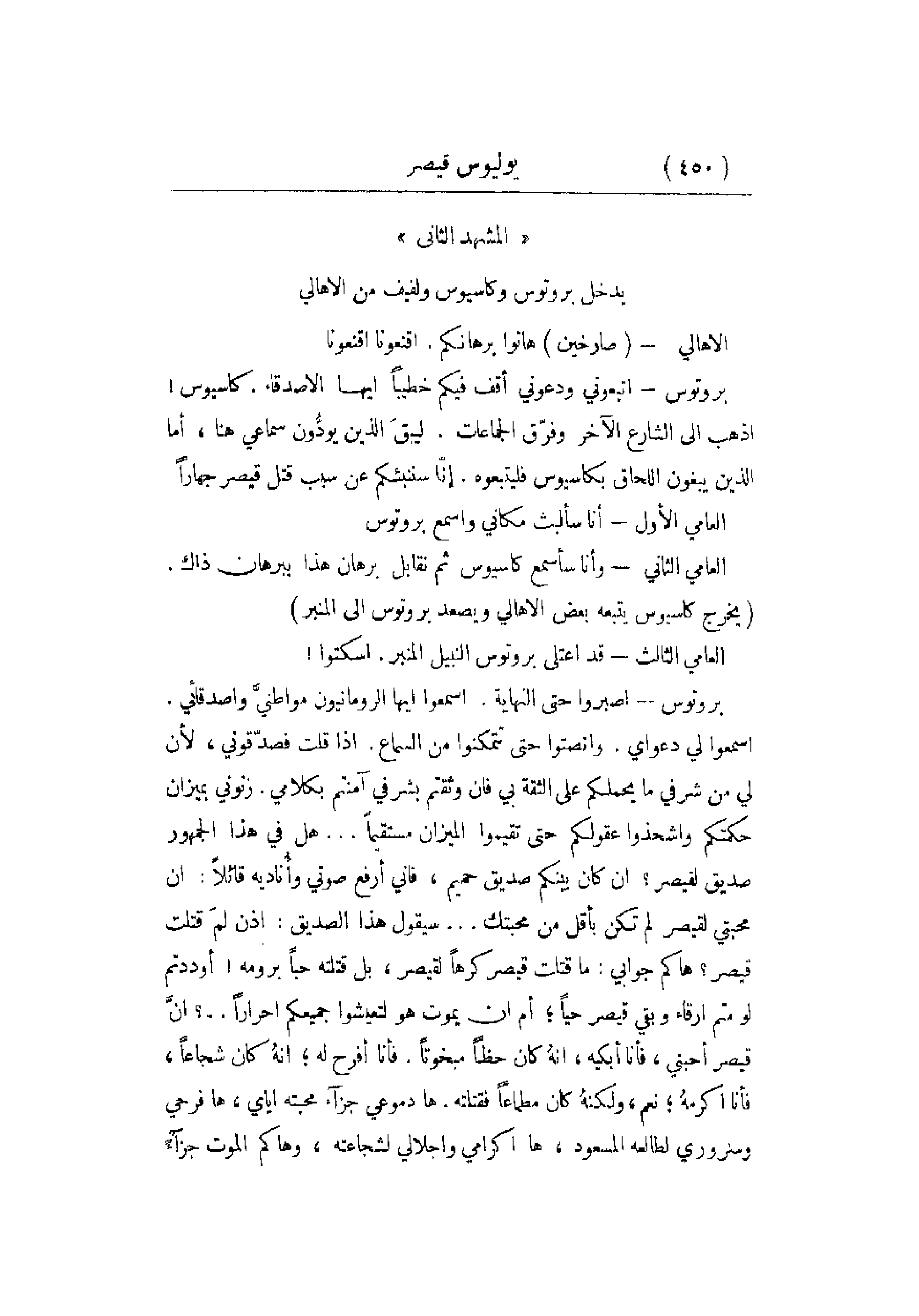 العامي الثالث - اصبروا حتى النهاية. اسمعوا أيها الرومانيون مواطنيَّ وأصدقائي. اسمعوا لي دعواي. وأنصتوا حتى تتمكنوا من السماع. إذا قلت فصدّقوني , لأن لي من شرفي ما يحملكم على الثقة بي فإن وثقتم بشرفي آمنتم بكلامي. زنوني بميزان حكمتكم واشحذوا عقولكم حتى تقيموا الميزان مستقيماً. . . هل في هذا الجمهور صديق لقيصر؟ إن كان بينكم صديق حميم , فإني أرفع صوتي وأُناديه قائلاً: إن محبتي لقيصر لم تكن بأقل من محبتكم. . . سيقول هذا الصديق: إذن لمَ قتلت قيصر؟ ها كم جوابي: ما قتلت قيصر كرهاً لقيصر , بل قتلته حباً برومه! أوددتم لو متم أرقاء وبقي قيصر حياً؛ أم إن يموت هو لتعيشوا جميعكم أحرارً. . .؟ إنَّ قيصر أحبني , فأنا أبكيه , إنهُ كان حظاً مبخوتاً. فأنا أفرح له؛ إنهُ كان شجاعاً , فأنا أكرمهً؛ م \ نعم , ولكنهُ كان مطماعاً فقتلته. ها دموعي جزاء محبته إياي , ها فرحي وسروري لطالعه المسعود , ها إكرامي وإجلالي لشجاعته , وها كم الموت جزاءً