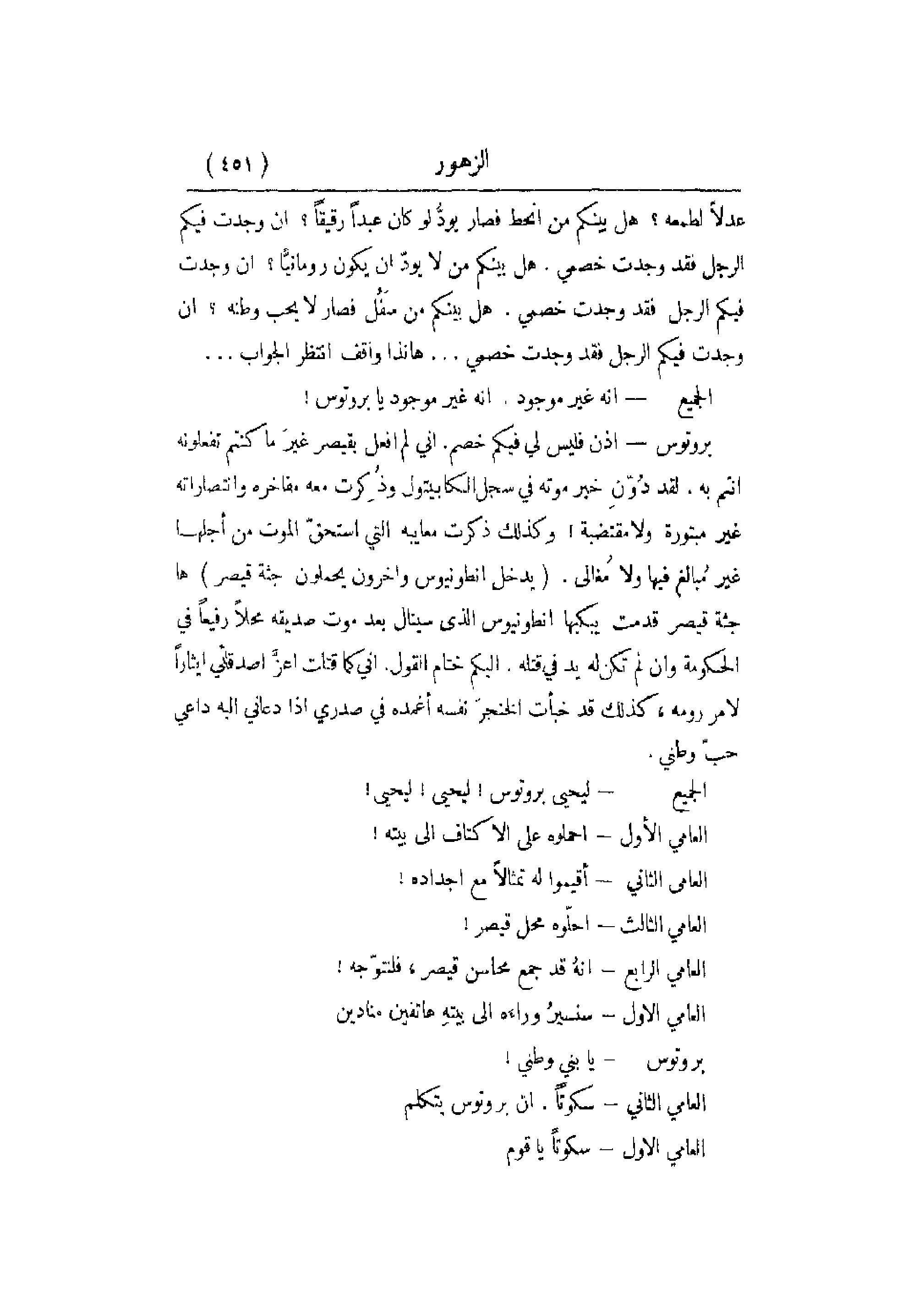 بروتوس - إذن فليس لي فيكم خصم. إني لم أفعل بقيصر غيرَ ما كنتم تفعلونه أنت به. لقد دُوّنِ خبر موته في سجل الكابيتول وذّكِرت معه مفاخره وانتصاراته غير مبتورة ولا مقتضبة! وكذلك ذكرت معايبه التي استحقّ الموت من أجلها غير مُبالغ فيا ولا مُغالي. يدخل أنطونيوس وآخرون يحملون جثة قيصر ها جثة قيصر قدمت يبكيها أنطونيوس الذي سينال بعد موت صديقه محلاً رفيعاً في الحكومة وإن لم تكن له يد في قتله. إليكم ختام القول. إني كما قلت أعزَّ أصدقائي إيثاراً لأمر رومه , كذلك قد خبأت الخنجر نفسه أغمده في صدري إذا دعاني إليه داعي حبّ وطني.