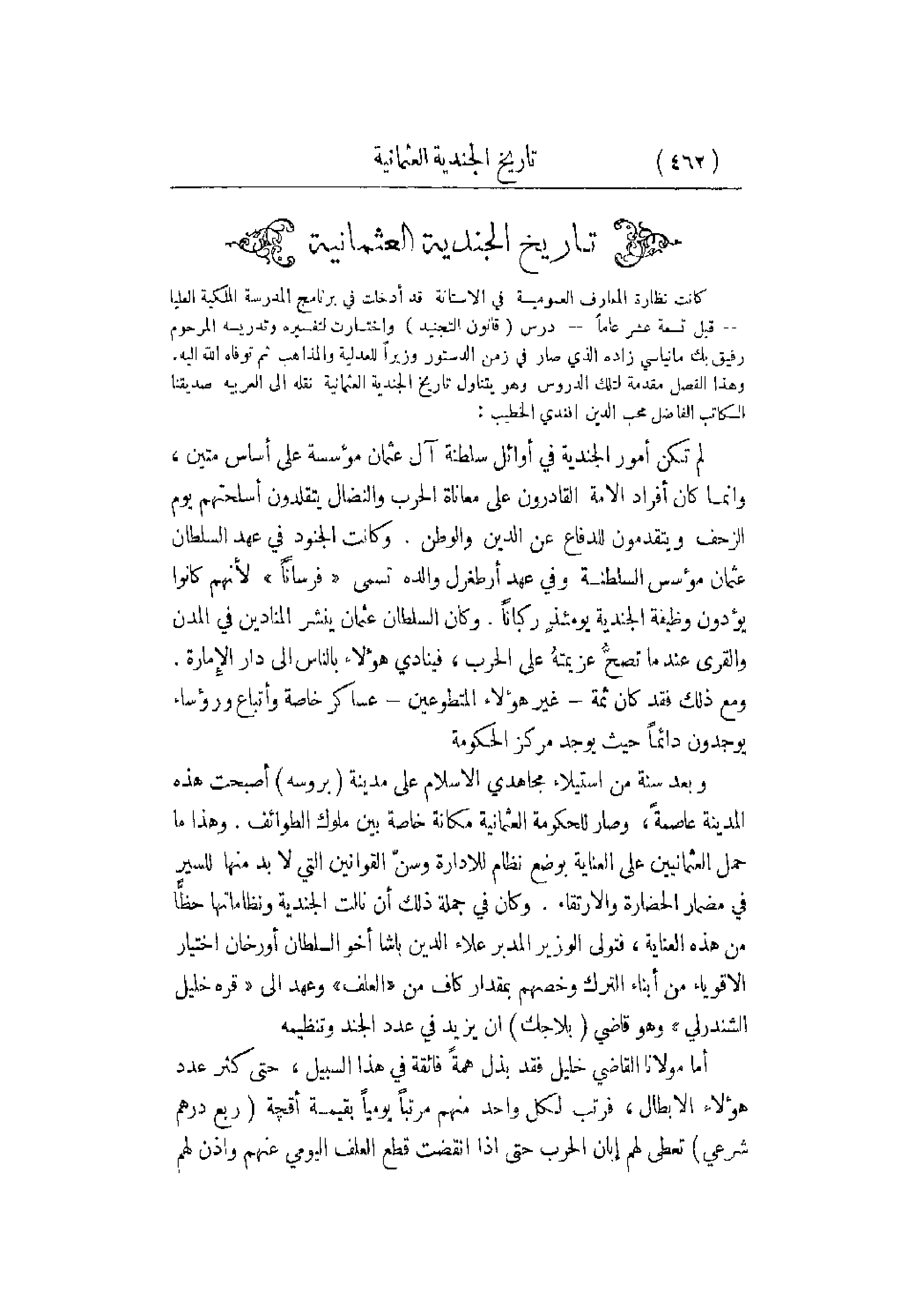 كانت نظارة المعارف العمومية في الآستانة قد أدخلت في برنامج المدرسة الملكية العليا - قبل تسعة عشر عاماً - درس قانون التجنيد واختارت لتفسيره وتدريسه المرحوم رفيق بك مانياسي زاده الذي صار في زمن الدستور وزيراً للعدلية والمذاهب ثم توفاه الله إليه. وهذا الفصل مقدمة لتلك الدروس وهو يتناول تاريخ الجندية العثمانية نقله إلى العربية صديقنا الكاتب الفاضل محب الدين أفندي الخطيب: