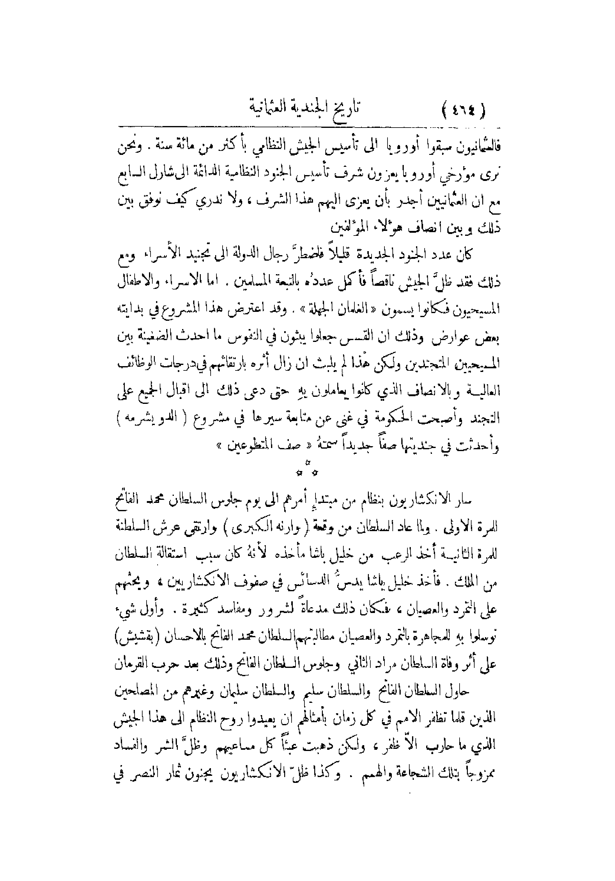 فالعثمانيون سبقوا أوروبا إلى تأسيس الجيش النظامي بأكثر من مائة سنة. ونحن نرى مؤرخي أوروبا يعزون شرف تأسيس الجنود النظامية الدائمة إلى شارل السابع مع أن العثمانيين أجدر بأن يعزى إليهم هذا الشرف , ولا ندري كيف نوفق بين ذلك وبين أنصاف هؤلاء المؤلفين. كان عدد الجنود الجديدة قليلاً فاضطرَّ رجال الدولة إلى تجنيد الأسراء ومع ذلك فقد ظلَّ الجيش ناقصاً فأكل عددُه بالتبعة المسلمين. أما الأسراء والأطفال المسيحيون فكانوا يسمون الغلمان الجهلة. وقد اعترض هذا المشروع في بدايته بعض عوارض وذلك أن القسس جعلوا يبثون في النفوس ما أحدث الضغينة بين المسيحيين المتجندين ولكن هذا لم يلبث أن زال أثره بارتقائهم في درجات الوظائف العالية وبالإنصاف الذي كانوا يعاملون بهِ حتى دعي ذلك إلى إقبال الجميع على التجند وأصبحت الحكومة في غنى عن متابعة سيرها في مشروع الدويشرمه وأحدثت في جنديتها صفاً جديداً سمتهُ صف المتطوعين.
