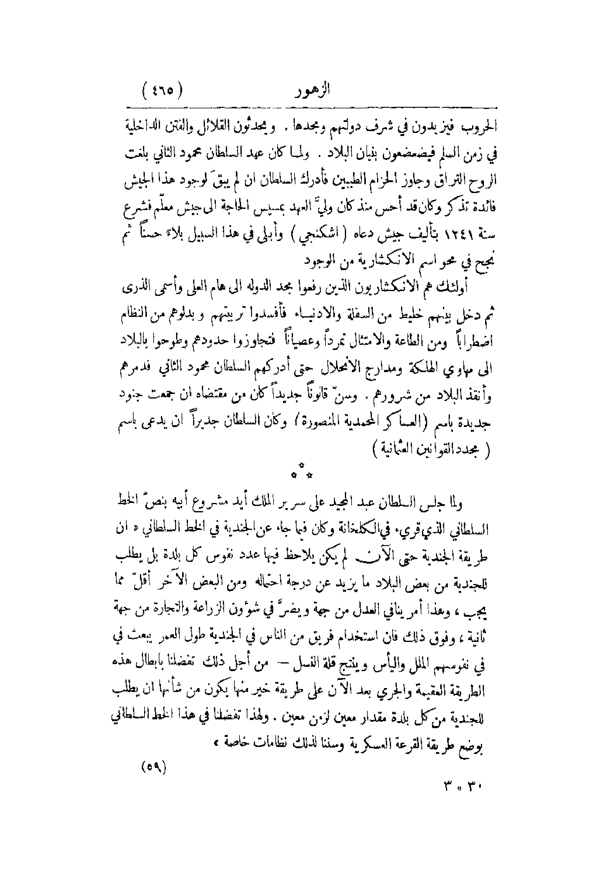 جهة ويضرَّ في شؤون الزراعة والتجارة من جهة ثانية , وفوق ذلك فإن استخدام فريق من الناس في الجندية طول العمر يبعث في نفوسهم الملل واليأس وينتج قلة النسل - من أجل ذلك تفضلنا بإبطال هذه الطريقة العميقة والجري بعد الآن على طريقة خير منها يكون من شأنها أن يطلب للجندية من كل بلدة مقدار معين لزمن معين. ولهذا تفضلن في هذا الخط السلطاني بوضع طريقة القرعة العسكرية وسننا لذلك نظامات خاصة