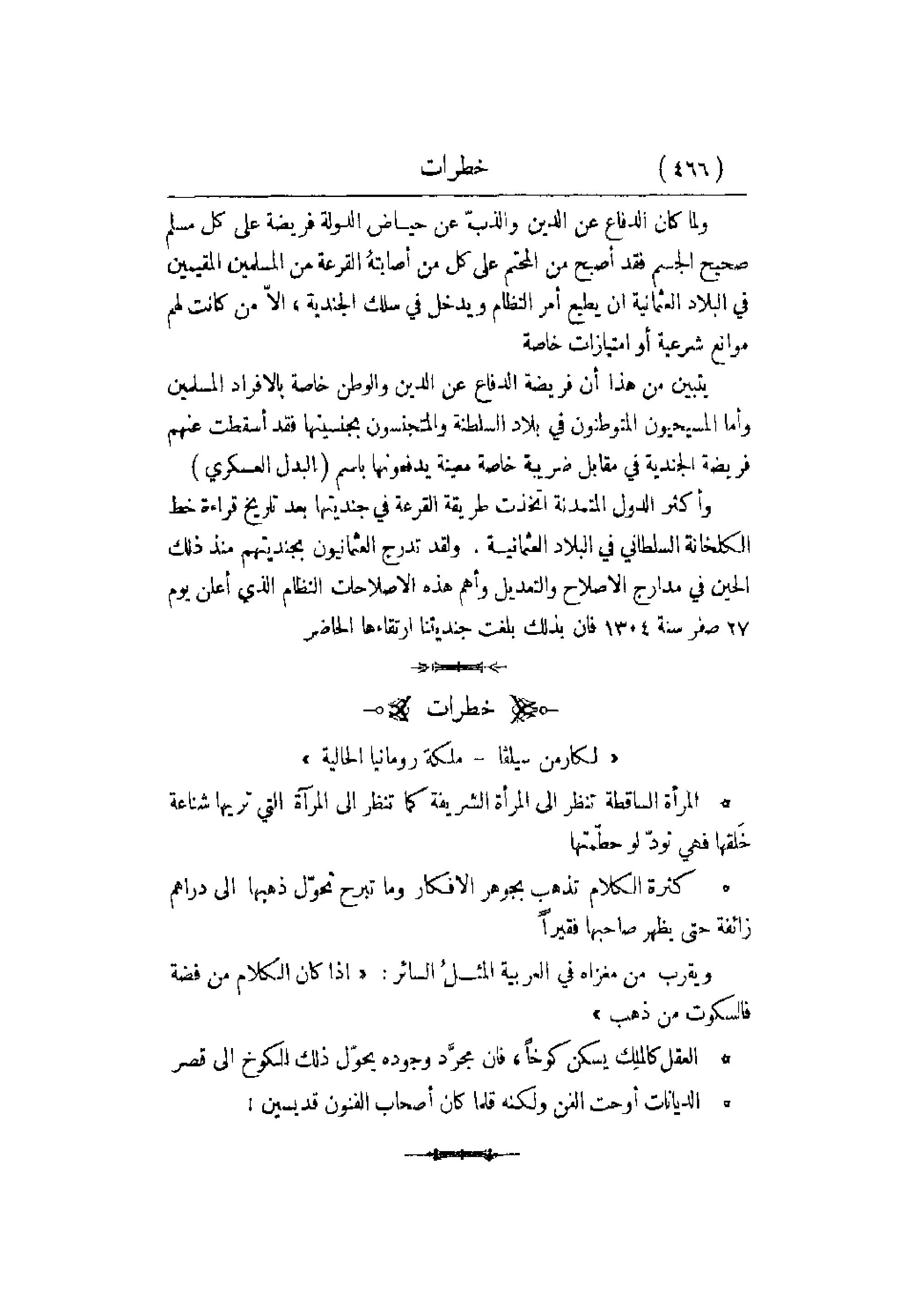 ولما كان الدفاع عن الدين والذبّ عن حياض الدولة فريضة على كل مسلم صحيح الجسم فقد أصبح من المحتم على كل من أصابتهُ لقرعة من المسلمين المقيمين في البلاد العثمانية أن يطيع أمر لنظام ويدخل في سلك الجندية , إلاّ من كانت لهم موانع شرعية أو امتيازات خاصة. يتبين من هذا أن فريضة الدفاع عن الدين والوطن خاصة بالأفراد المسلمين وأما المسيحيون المتوطنون في بلاد السلطنة والمتجنسون بجنسيتها فقد أسقطت عنهم فريضة الجندية في مقابل ضريبة خاصة معينة يدفعونها باسم البدل العسكري وأكثر الدول المتمدنة اتخذت طريقة القرعة في جنديتها بعد تاريخ قراءة ذلك الحين في مدارج الإصلاح والتعديل وأهم هذه الإصلاحات النظام الذي أعلن يوم 27 صفر سنة 1304 فإن بذلك بلغت جنديتنا ارتقاءها الحاضر.