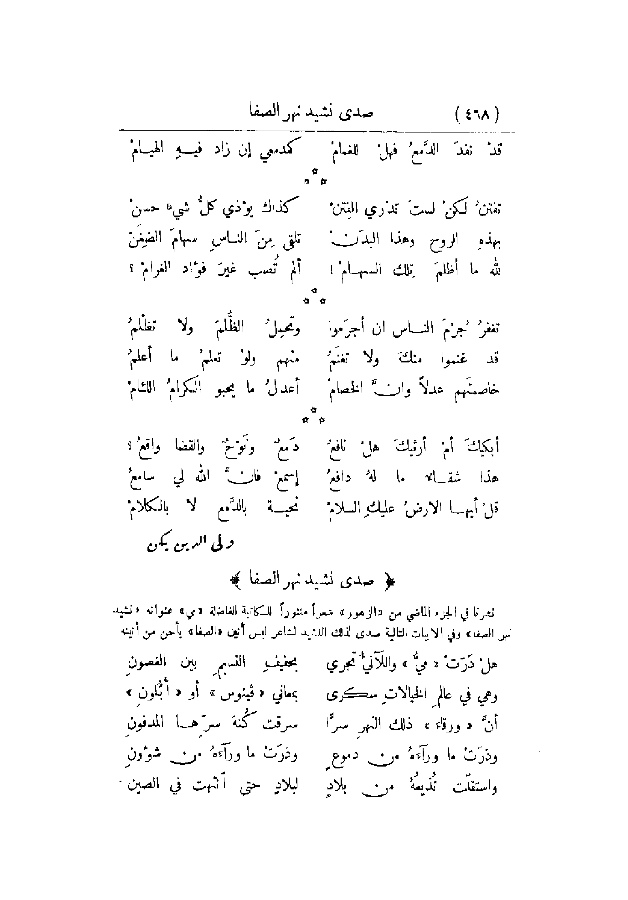 نشرنا في الجزء الماضي من الزهور شعراً منثوراً للكاتبة الفاضلة مي عنوانه نشيد نهر الصفا وفي الأبيات التالية صدى لذلك النشيد لشاعر ليس أنين الصفا بأحن من أنينه: