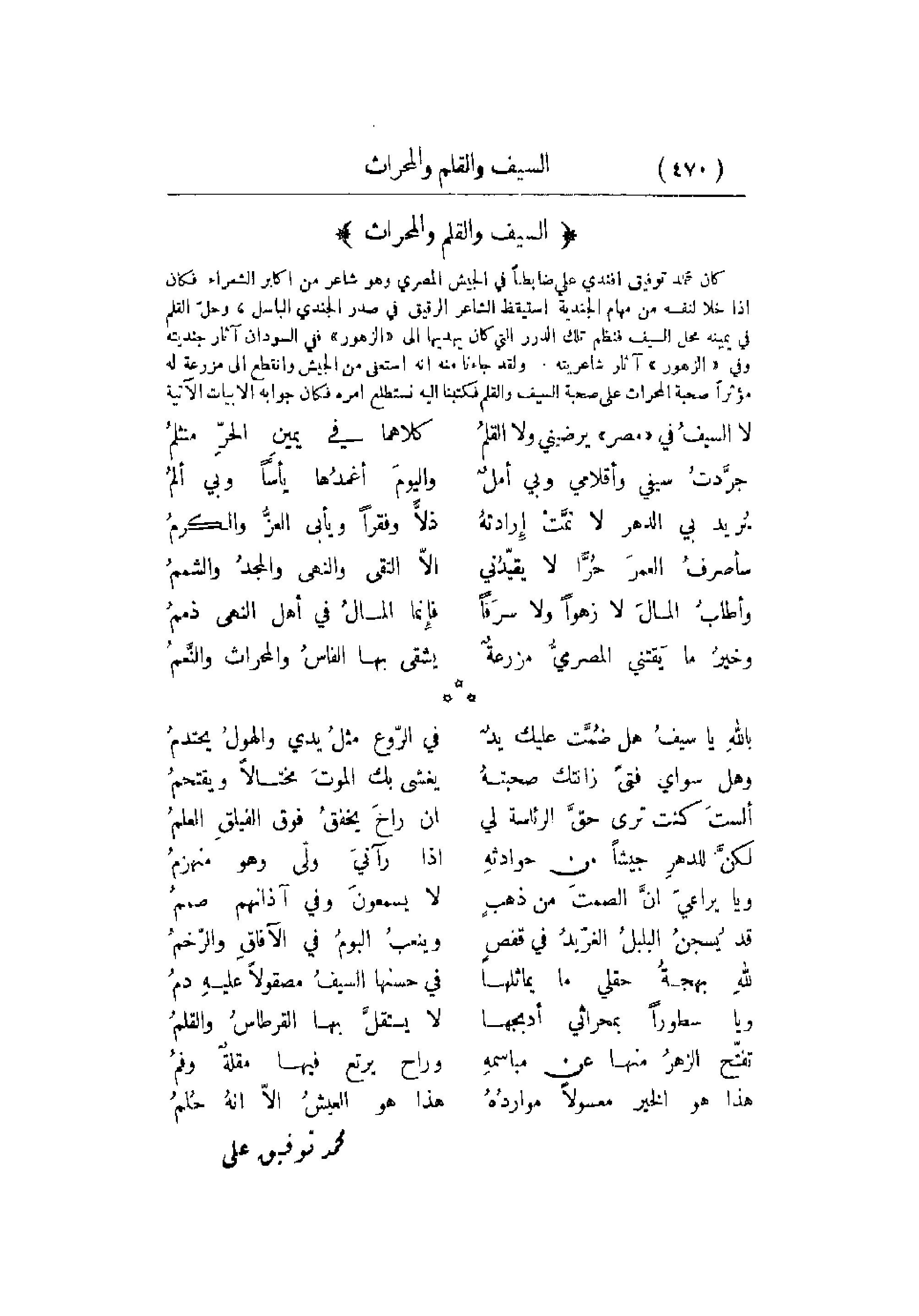 كان محمد توفيق أفندي علي ضابطاً في الجيش المصري وهو شاعر من أكابر الشعراء فكان إذا خلا لنفسه من مهام الجندية استيقظ الشاعر الرقيق في صدر الجندي الباسل , وحلّ القلم في يمينه محل السيف فنظم تلك الدرر التي كان يهديها إلى الزهور ففي السودان آثر جنديته وفي الزهور آثار شاعريته. ولقد جاءنا منه أنه استعفي من الجيش وانقطع إلى مزرعة له مؤثراً صحبة المحراث على صحبة السيف والقلم فكتبنا إليه نستطلع أمره فكان جوابه أبيات الآتية: