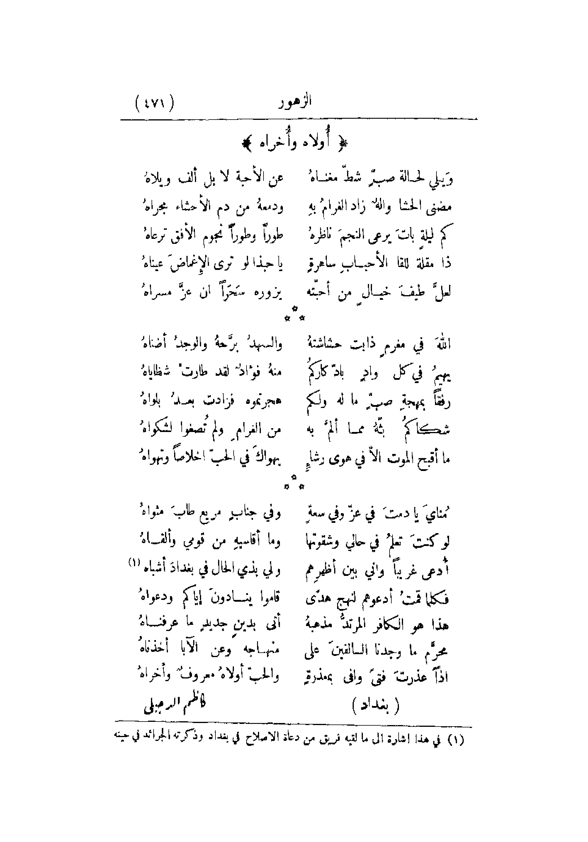 أُدعي غريباً وإني بين أظهرِهم ... ولي بذي الحال في بغدادَ أشباه
