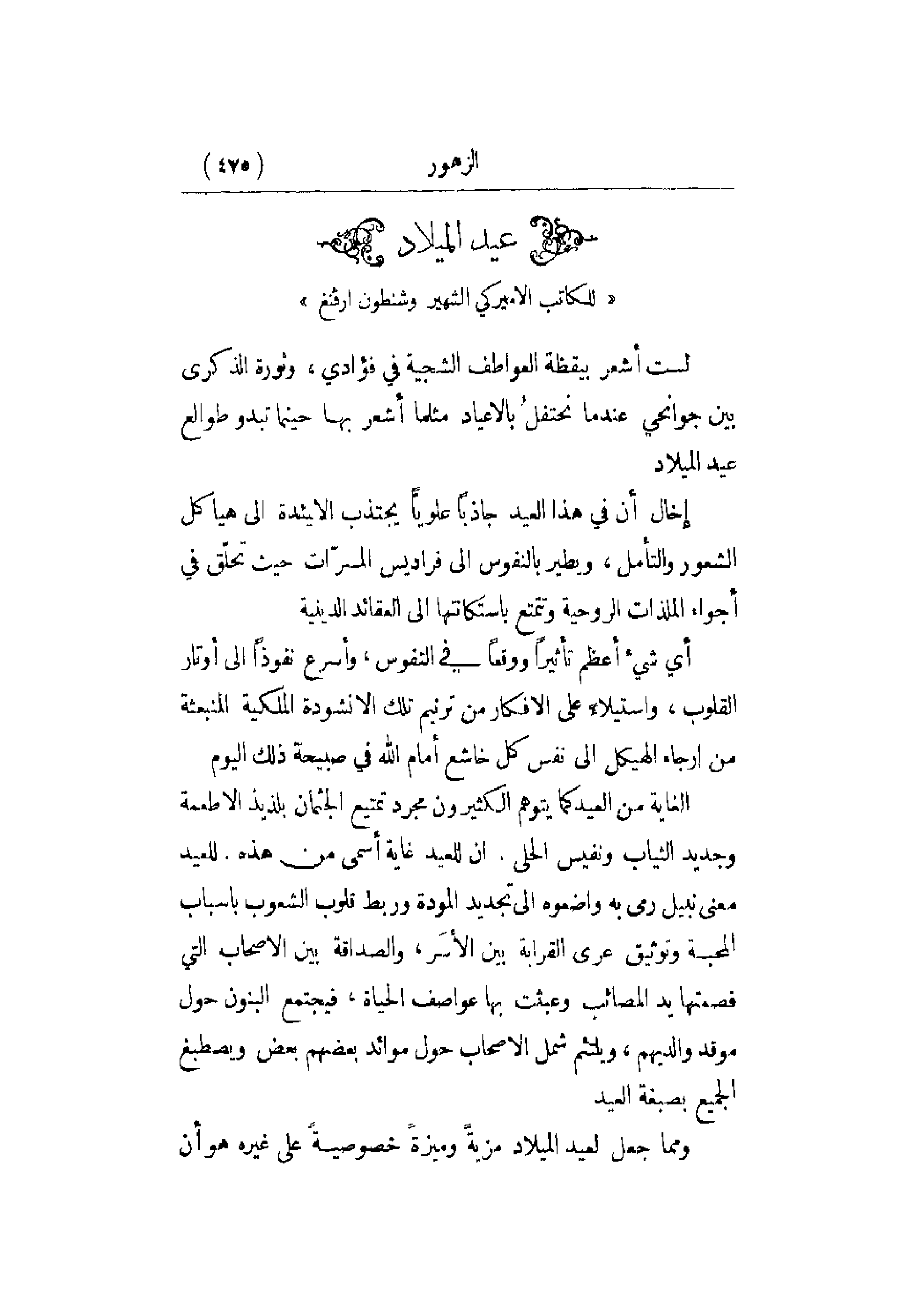 لست أشعر بيقظة العواطف الشجية في فؤادي , وثورة الذكرى بين جوانحي عندما نحتفلُ بالأعياد مثلما أشعر بها حينما تبدو طوالع عيد الميلاد. إخال أن في هذا العيد جاذباً علويّاً يجتذب الايئدة إلى هياكل الشعور والتأمل , ويطير بالنفوس إلى فراديس المسرّات حيث تحلّق في أجواء الملذات الروحية وتتمتع باستكانتها إلى العقائد الدينية. أي شيء أعظم تأثيراً ووقعاً في النفوس , وأسرع نفوذاً إلى أوتار القلوب , واستيلاءَ على الأفكار من ترنيم تلك الأنشودة الملكية المنبعثة من أرجاء الهيكل يتوهم الكثيرون مجرد تمتيع الجثمان بلذيذ الأطعمة وجديد الثياب ونفيس الحلي. إن للعيد غاية أسمى من هذه. للعيد معنى نبيل رمى به واضعوه إلى تجديد المودة وربط قلوب الشعوب بأسباب المحبة وتوثيق عرى الفرابة بين الأسر , والصداقة بين الأصحاب التي فصمتها يد المصائب وعبثت بها عواصف الحياة , فيجتمع البنون حول موقد والديهم , ويلتئم شمل الأصحاب حول موائد بعضهم بعض ويصطبغ الجميع بصبغة العيد. ومما جعل لعيد الميلاد مزيةً وميزةً خصوصيةً على غيره هو أن