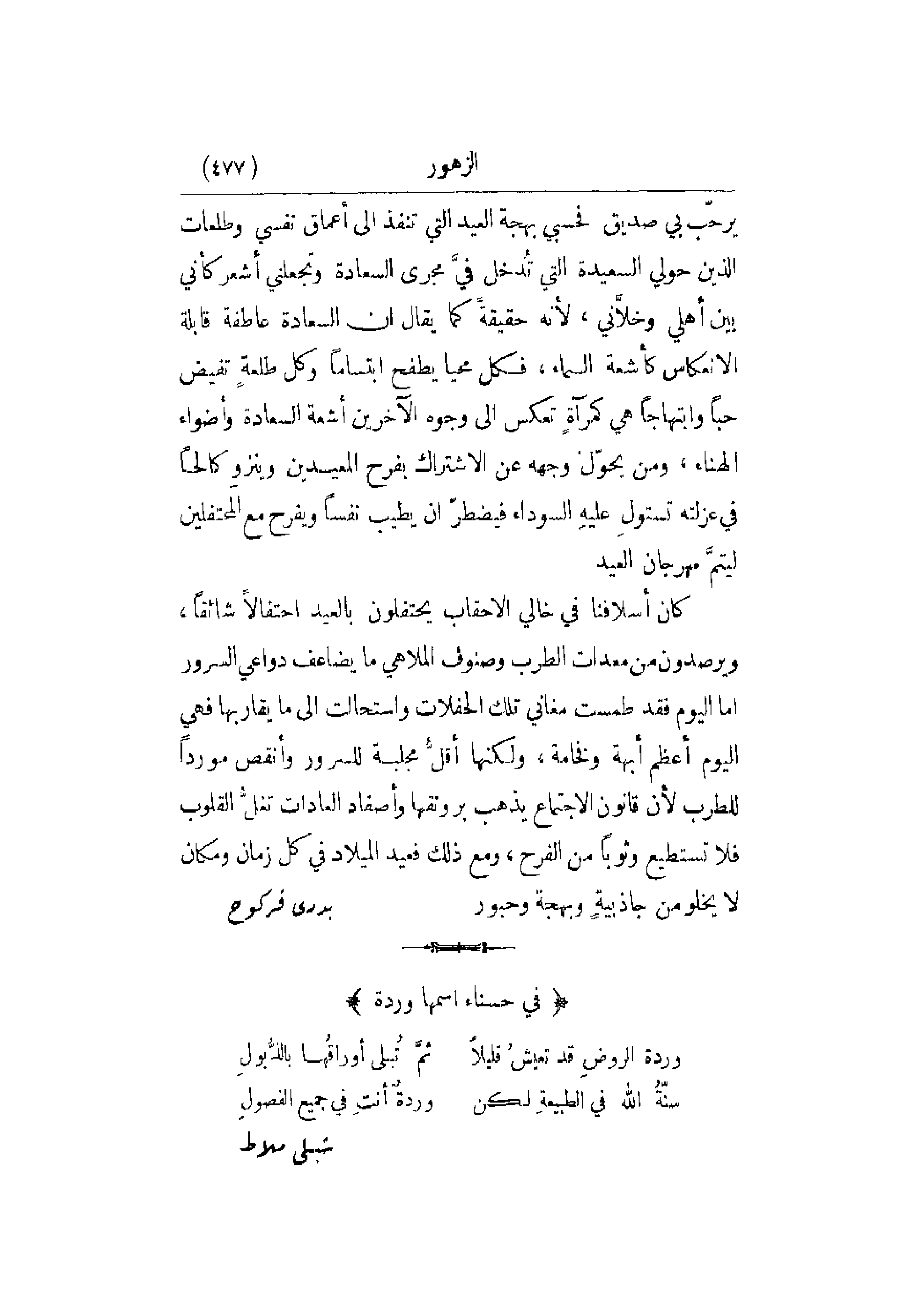 يرحّب بي صديق فحسبي بهجة العيد التي تنفذ إلى أعماق نفسي وطلعات الذين حولي السعيدة التي تُدخل فيَّ مجرى السعادة وتجعلني أشعر كأني بين أهلي وخلاَّني , لأنه حقيقةً كما يقال أن السعادة عاطفة قابلة الانعكاس كأشعة السماء , فكل محيا يطفح ابتساماً وكل طلعةٍ تفيض حباً وابتهاجاً هي كمرآةٍ تعكس إلى وجوه الآخرين أشعة السعادة وأضواء الهناء , ومن يحوّل وجهه عن الاشتراك بفرح المعيدين وينزوِ كالحاً في عزلته تستولِ عليهِ السوداء فيضطّر أن يطيب نفساً ويفرح مع المحتفلين ليتمَّ مهرجان العيد. كان أسلافنا في خالي الأحقاب يحتفلون بالعيد احتفالاً شائقاً , ويرصدون من معدات الطرب وصنوف الملاهي ما يضاعف دواعي السرور أما اليوم أعظم أبهة وفخامة , ولكنها أقلُّ مجلبة للسرور وأنقص مورداً للطرب لأن قانون الاجتماع يذهب برونقها وأصفاد العادات تغلُّ القلوب فلا تستطيع وثوباً من الفرح , ومع ذلك فعيد الميلاد في كل زمان ومكان لا يخلو من جاذبيةٍ وبهجة وحبور.