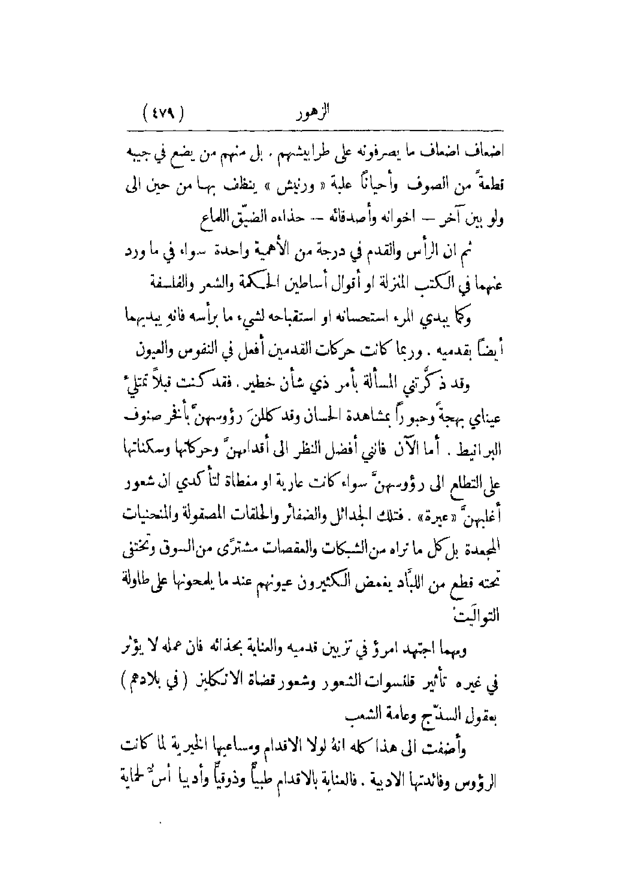 قضاة الانكليز في بلادهم بعقول السذّج وعامة الشعب. وأضفت إلى هذا كله أنهُ لولا الأقدام ومساعيها الخيرية لما كانت الرؤوس وفائدتها الأدبية. فالعناية بالإقدام طيبّاً وذوقيّاً وأبيا أسٌّ لحماية