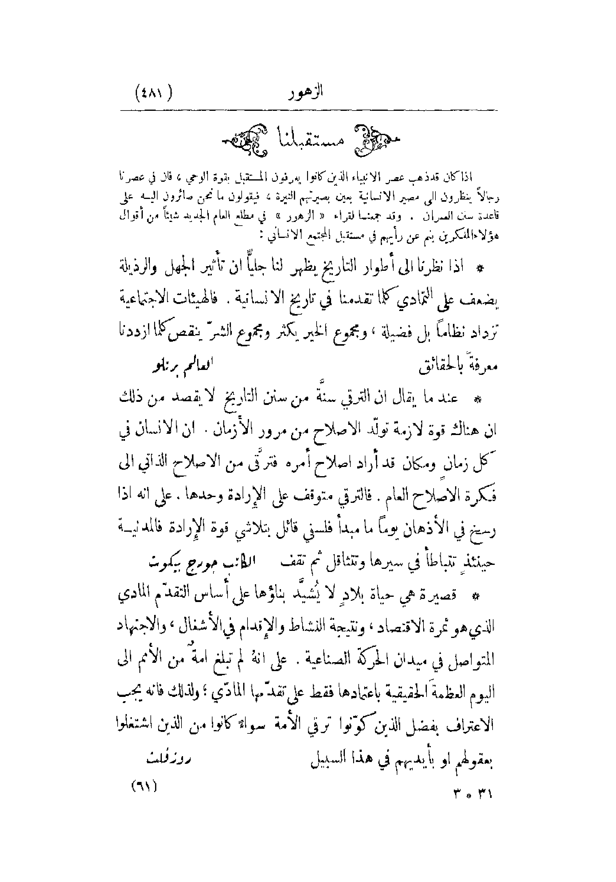 إذا كان قد ذهب عصر الأنبياء الذين كانوا يعرفون المستقبل بقوة الوحي , فإن في عصرنا رجالاً ينظرون إلى مصير الإنسانية بعين بصيرتهم النيرة , فيقولون ما نحن صائرون إليهِ على قاعدة سنن العمران. وقد جمعنا لقراء الزهور في مطلع العام الجديد شيئاً من أقوال هؤلاء المفكرين يتم عن رأيهم في مستقبل المجتمع الإنساني: إذا نظرنا إلى أطوار التاريخ يظهر لنا جليّاً أن تأثير الجهل والرذيلة يضعف على التمادي كلما تقدمنا في تاريخ الإنسانية. فالهيئات الاجتماعية تزداد نظاماً بل فضيلة , ومجموع الخير يكثر ومجموع الشرّ ينقص كلما ازددنا معرفة بالحقائق.