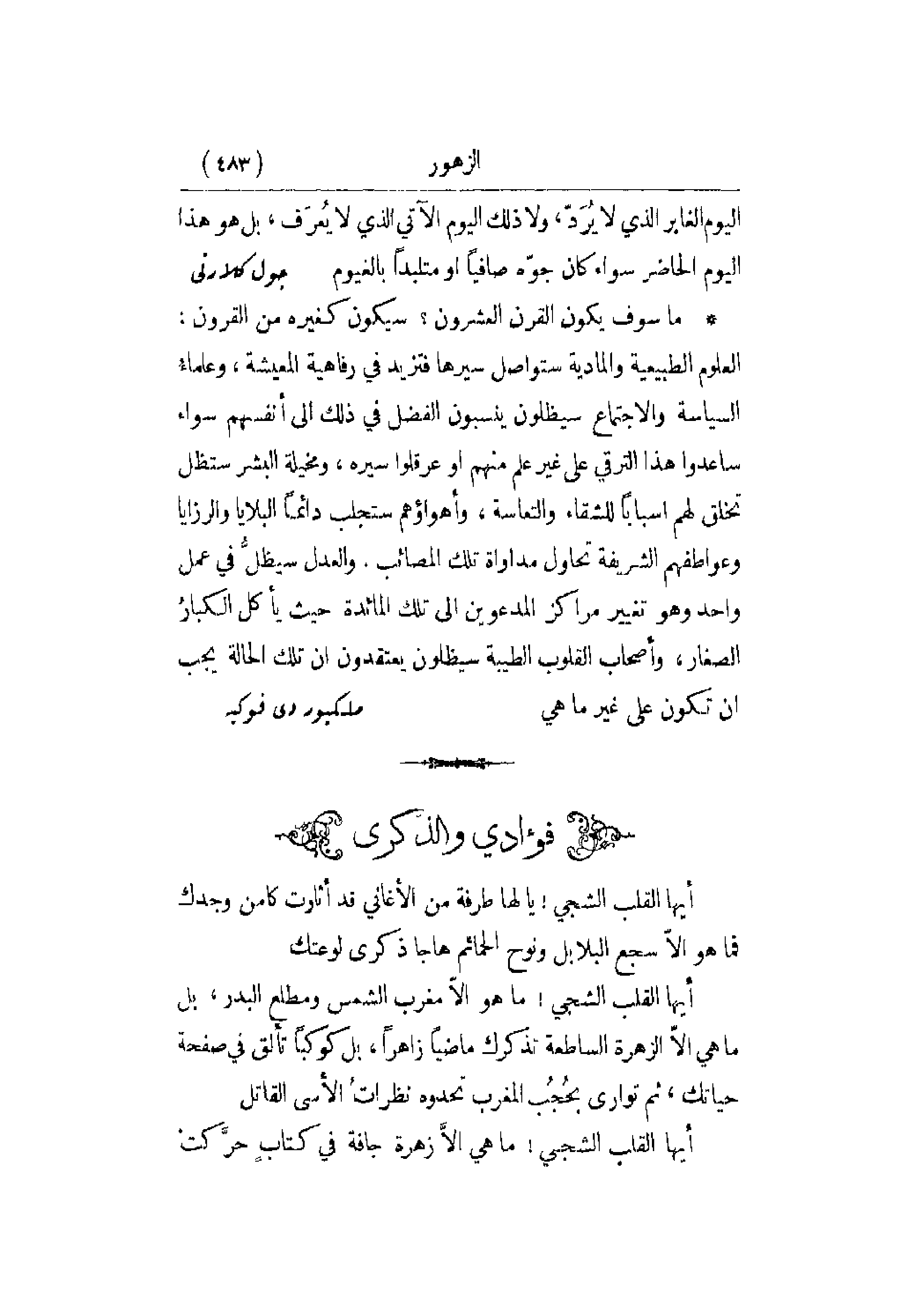 أيها القلب الشجي! يا لها طرفة من الأغاني قد أثارت كامن وجدك فما هو إلاّ سجع البلابل ونوح الحمائم هاجا ذكرى لوعتك. أيها القلب الشجي! ما هو إلاّ مغرب الشمس ومطلع البدر , بل ما هي إلاّ الزهرة الساطعة تذكرك ماضياً زاهراً , بل كوكباً تألق في صفحة حياتك , ثم توارى بحُجُب المغرب تحدوه نظراتُ الأسى القاتل. أيها القلب الشجي! ما هي إلاَّ زهرة جافة في كتابٍ حرَّكتْ