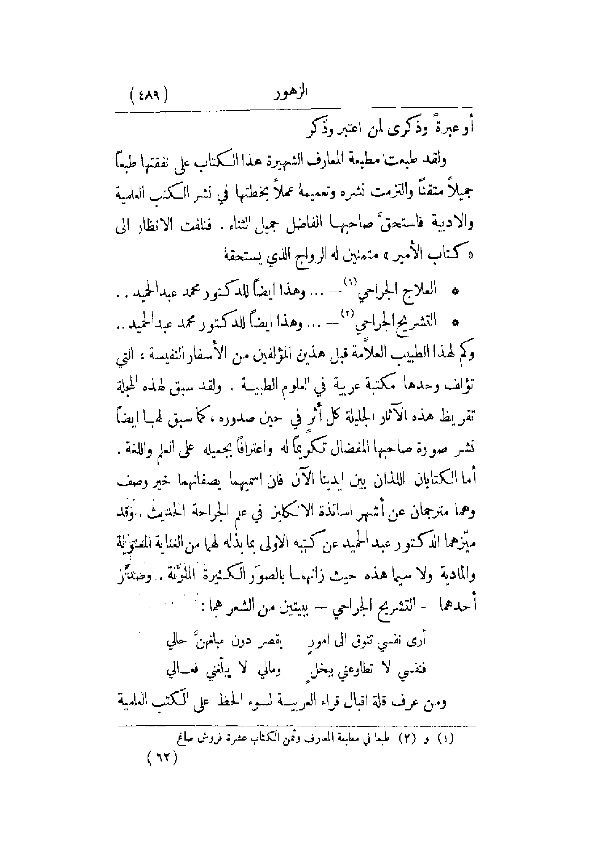 وكم لهذا الطبيب العلاَّمة قبل هذين المؤلفين من الأسفار النفسية , التي تؤلف وحدها مكتبة عربية في العلوم الطبية. ولقد سبق لهذه المجلة تقريظ هذه الآثار الجليلة كل أثرٍ في حين صدوره , كما سبق لهه أيضاً نشر صورة صاحبها المفضال تكريماً له واعترافاً بجميله على العلم واللغة. أما الكتابان اللذان بين أيدينا الآن فإن اسميها يصفانهما خير وصف وهما مترجمان عن أشهر أساتذة الانكليز في علم الجراحة الحديث. وقد ميّزهما الدكتور عبد الحميد عن كتبه الأولى بما بذله لهما من العناية المعنوية والمادية ولاسيما هذه حيث زانهما بالصوَر الكثيرة الملوَّنة. وصدَّر أحدهما - التشريح الجراحي - ببيتين من الشعر هم: