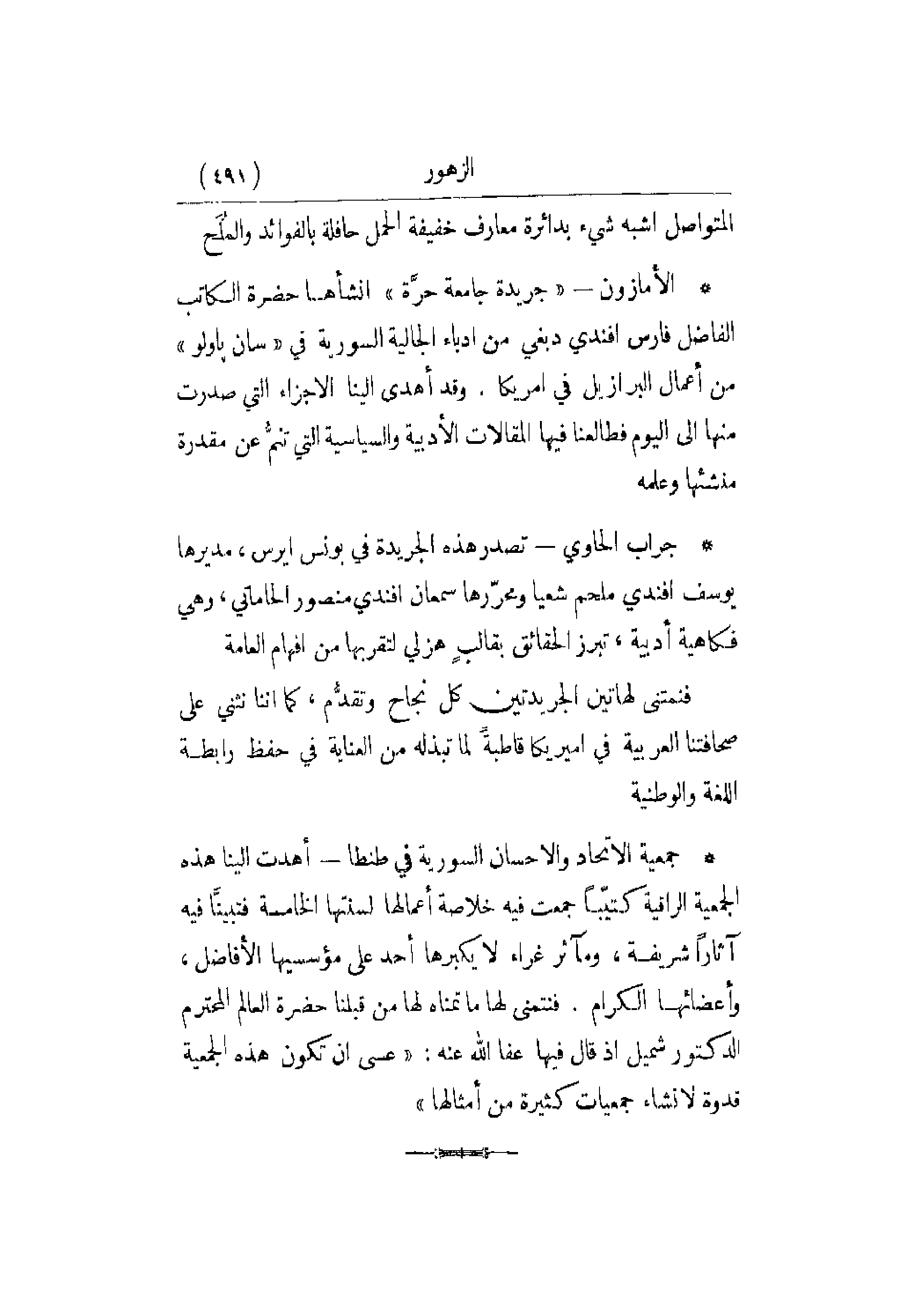 الأمازون - جريد جامعة حرَّة أنشأها حضرة الكاتب الفاضل فارس أفندي دبغي من أدباء الجالية السورية في سان باولو من أعمال البرازيل في أمريكا. وقد أهدي إلينا الأجزاء التي صدرت منها إلى اليوم فطالعنا فيها المقالات الأدبية والسياسية التي تنمُّ عن مقدرة منشئها وعلمه.