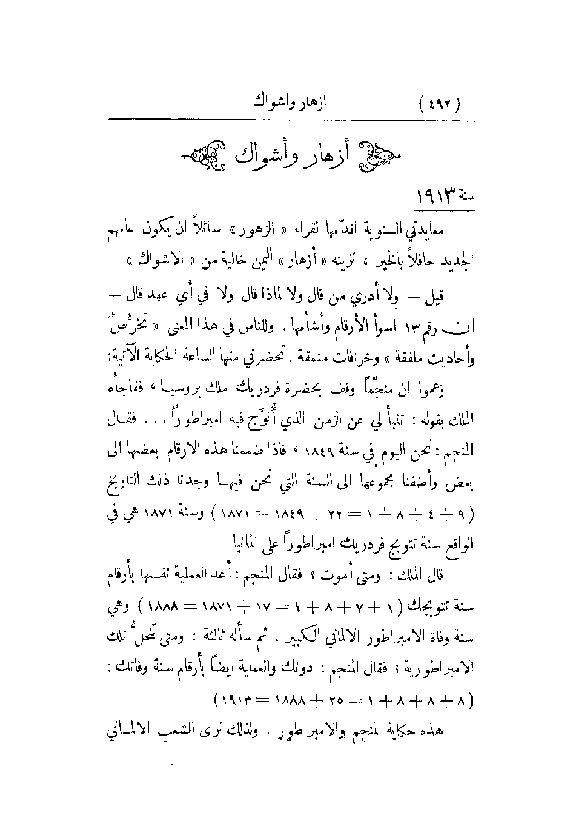 قيل - ولا أدري من قال ولا لماذا قال ولا أي عهد قال - أن رقم 13 أسوأ الأرقام وأشأمها. وللناس في هذا المعنى تخرُّصٌ وأحاديث ملفقة وخرافات منمقة. تحضرني منها الساعة الحكاية الآتية: زعموا أن منجّماً وقف بحضرة فردريك ملك بروسيا , ففاجأه الملك بقوله: تنبأ لي عن الزمن الذي أُنوَّج فيه إمبراطوراً. . . فقال المنجم: نحن مجموعة إلى السنة التي نحن فيها وجدنا ذلك التاريخ 9 + 4 + 8 + 1=22 + 1849=1871 وسنة 1871 هي في الواقع سنة تتويج فردريك إمبراطوراً على ألمانيا. قال الملك: ومتى أموت؟ فقال المنجم: أعد العملية نفسها بأرقام سنة تتويجك 1 + 7 + 8 + 1=17 + 1871=1888 وهي سنة وفاة الإمبراطور الألماني الكبير. ثم سأله ثالثةً: ومتى تنحلُّ تلك الإمبراطورية؟ فقال المنجم: دونك والعملية أيضاً بأرقام سنة وفاتك: 8 + 8 + 8 + 1=25 + 1888=1913 هذه حكاية المنجم والإمبراطور. لذلك ترى الشعب الألماني