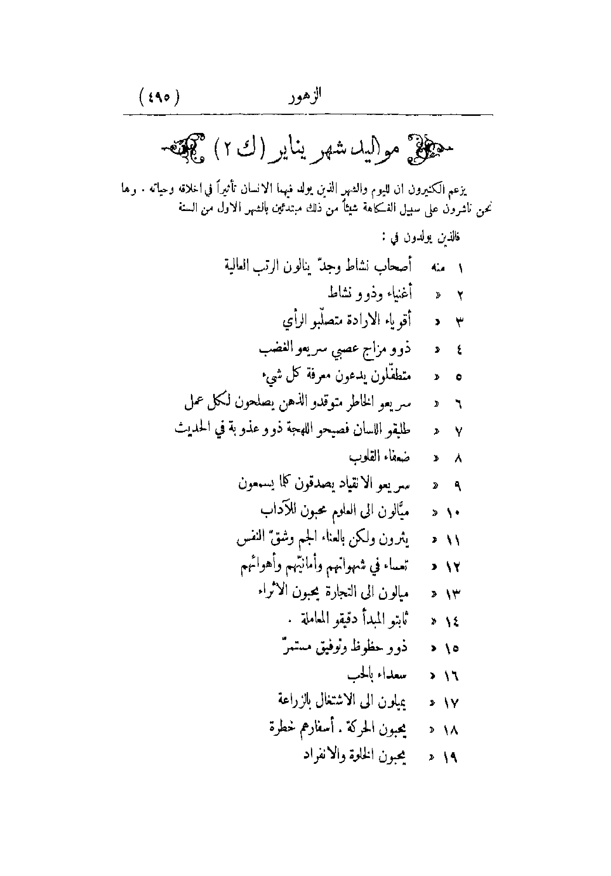يزعم الكثيرون أن لليوم والشهر الذين يولد فيهما الإنسان تأثيراً في إخلافه وحياته. وها نحن ناشرون على سبيل الفكاهة شيئاً من ذلك مبتدئين بالشهر الأول من السنة. فالذين يولدون في: