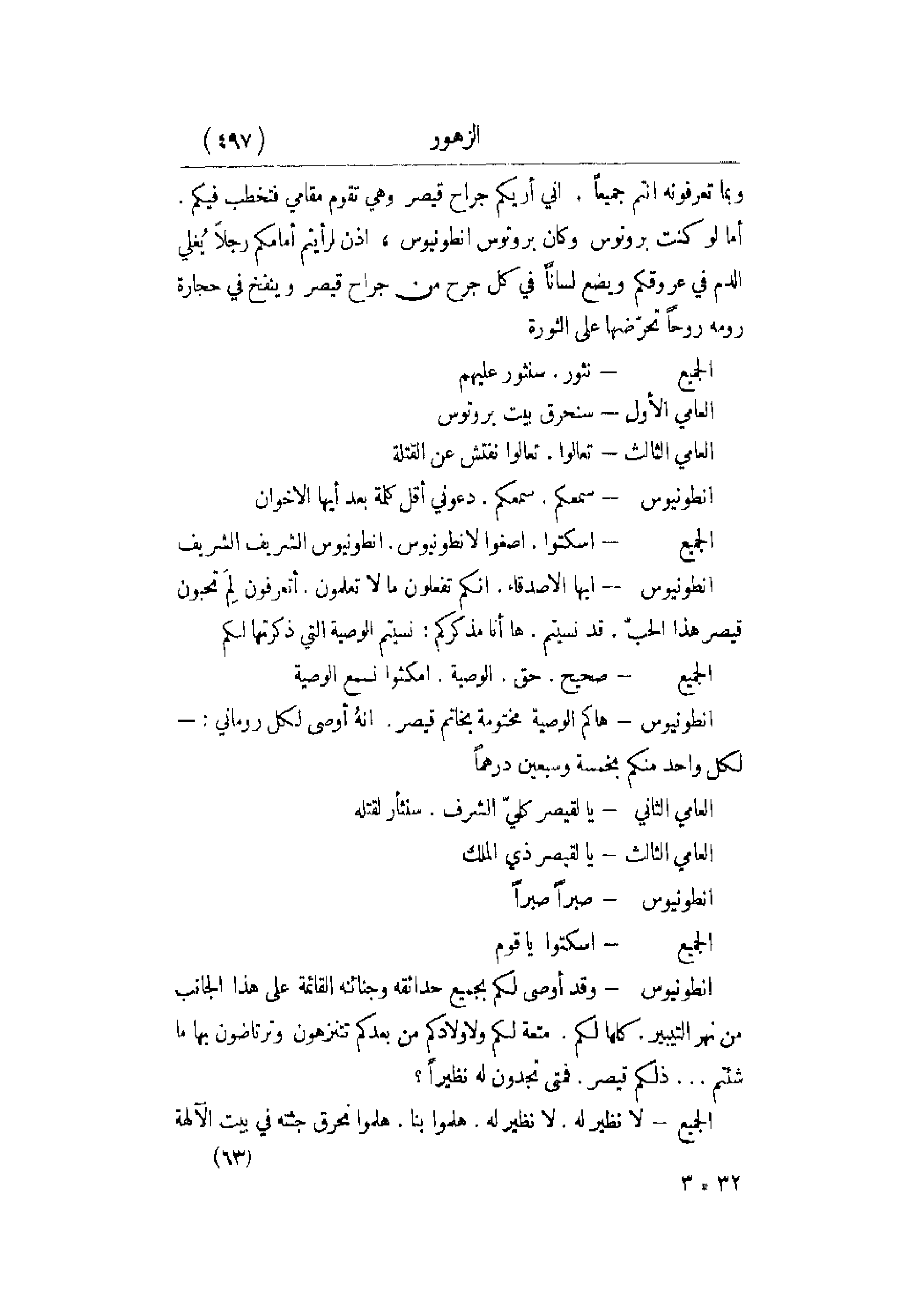 أنطونيوس - أيها الأصدقاء , إنكم تفعلون ما لا تعلمون. أتعرفون لِِمَ تحبون قيصر هذا لحبّ. قد نسيتم. ها أنا مذكركم: نسيتم الوصية التي ذكرتها لكم.