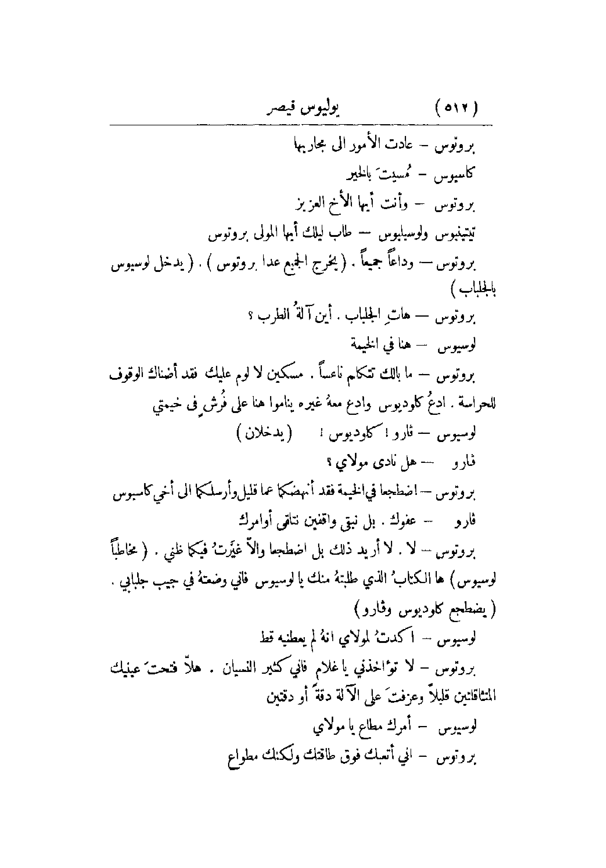بروتوس - لا. لا أريد ذلك بل اضطجعنا وإلاّ غيّرتُ فيكما ظني مخاطباً لوسيوس ها الكتابُ الذي طلبتهُ منك يا لوسيوس فإني في جيب جلباني. يضطجع كلوديس وفارو