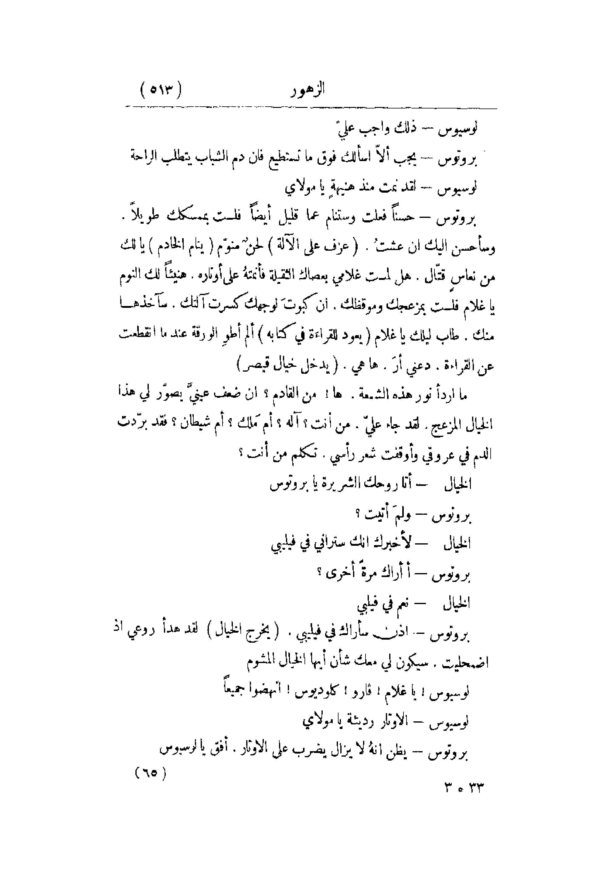 عشتُ عزف على الآلة لحنٌ منوّم ينام الخادم يا لك من نعاسٍ قتّال. هل لمست غلامي بعصاك الثقيلة فأنمتهُ على أوتاره. هنيئاً لك النوم يا غلام فلست بمزعجك وموقظك. إن كبوتَ لوجهك كسرت آلتك. سآخذها منك. طاب ليلك يا غلام يعود للقراءة في كتابه الم أطوِ الورقة عندما انقطعت عن القراءة. دعني أرَ. ها هي يدخل خيال قيصر ما أردأ نور هذه الشمعة. ها! من القادم؟ إن ضعف عينيَّ يصوّر لي هذا الخيال المزعج لقد جاء عليّ. من أنت؟ آله؟ أم مثلك؟ أم شيطان؟ فقد برّدت الدم في عروقي وأوقفت شعر رأسي. يتكلم من أنت؟
