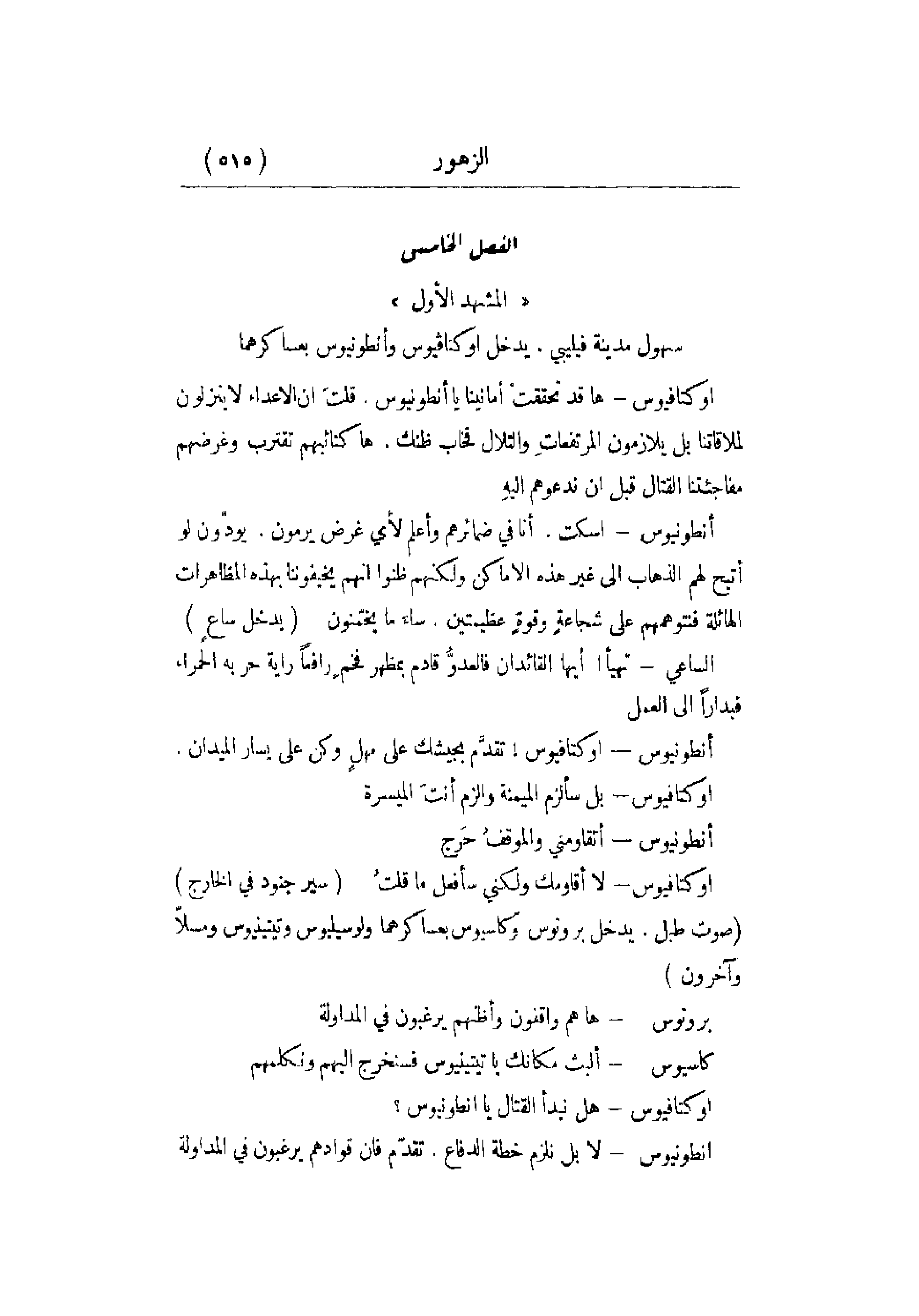 أنطونيوس - اسكت. أنا في ضمائرهم وأعلم لأي غرض يرمون. يودّون لو أتيح لهم الذهاب إلى غير هذه الأماكن ولكنهم ظنوا أنهم يخيفوننا بهذه المظاهرات الهائلة فنتوهمهم على شجاعةٍ وقوةٍ عظيمتين. ساءَ ما يخمّنون يدخل ساعٍ