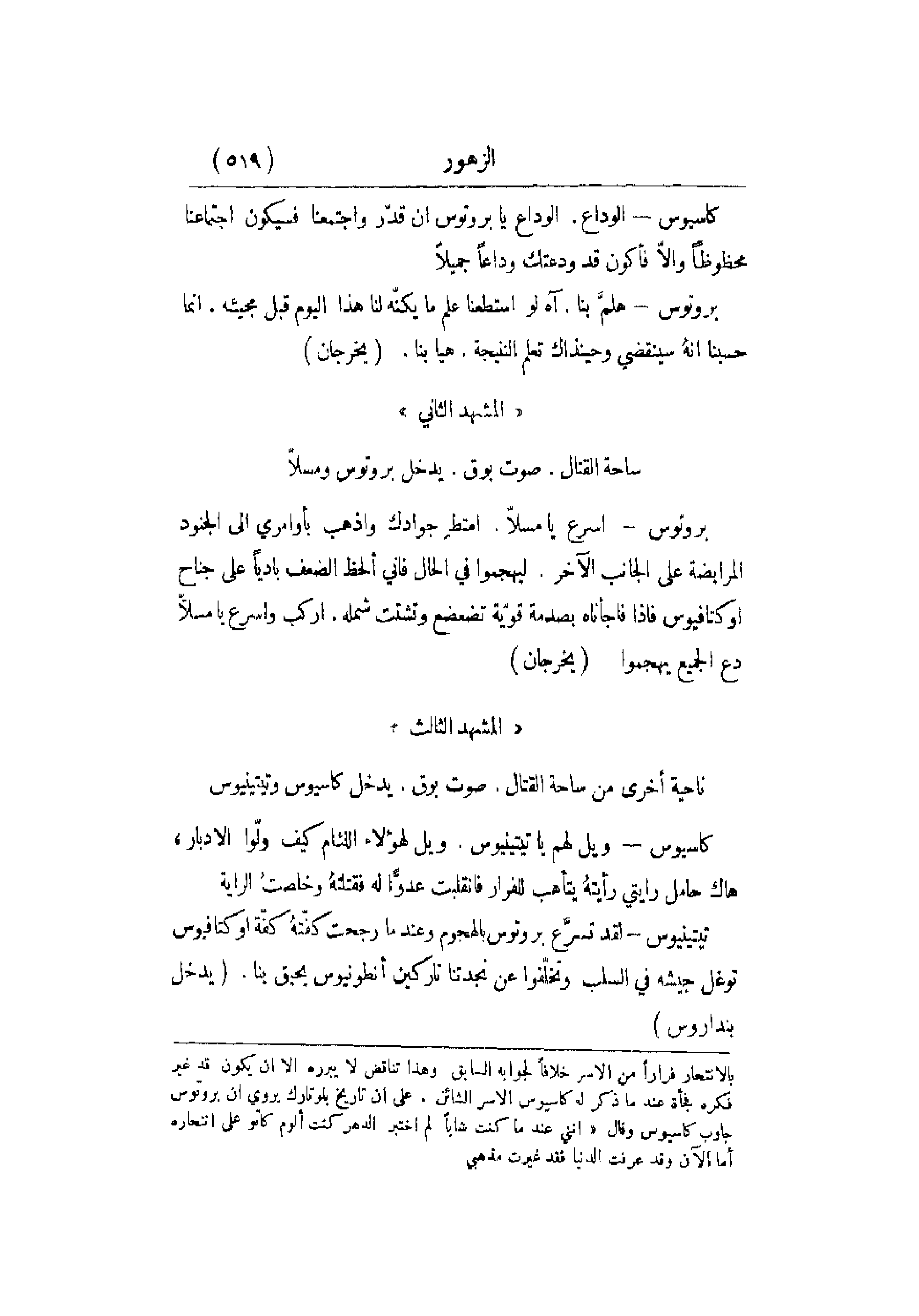 بروتوس - أسرع يا مسلاّ. امتطٍ جوادك واذهب بأوامري إلى الجنود المرابضة على الجانب الآخر. ليهجموا في الحال فإني ألحظ الضعف بادياً على جناح اوكتافيوس فإذا فاجأناه بصدمة قوّية تضعضع وتشتت شمله. اركب وأسرع يا مسلاّ دع الجميع يهجموا يخرجان