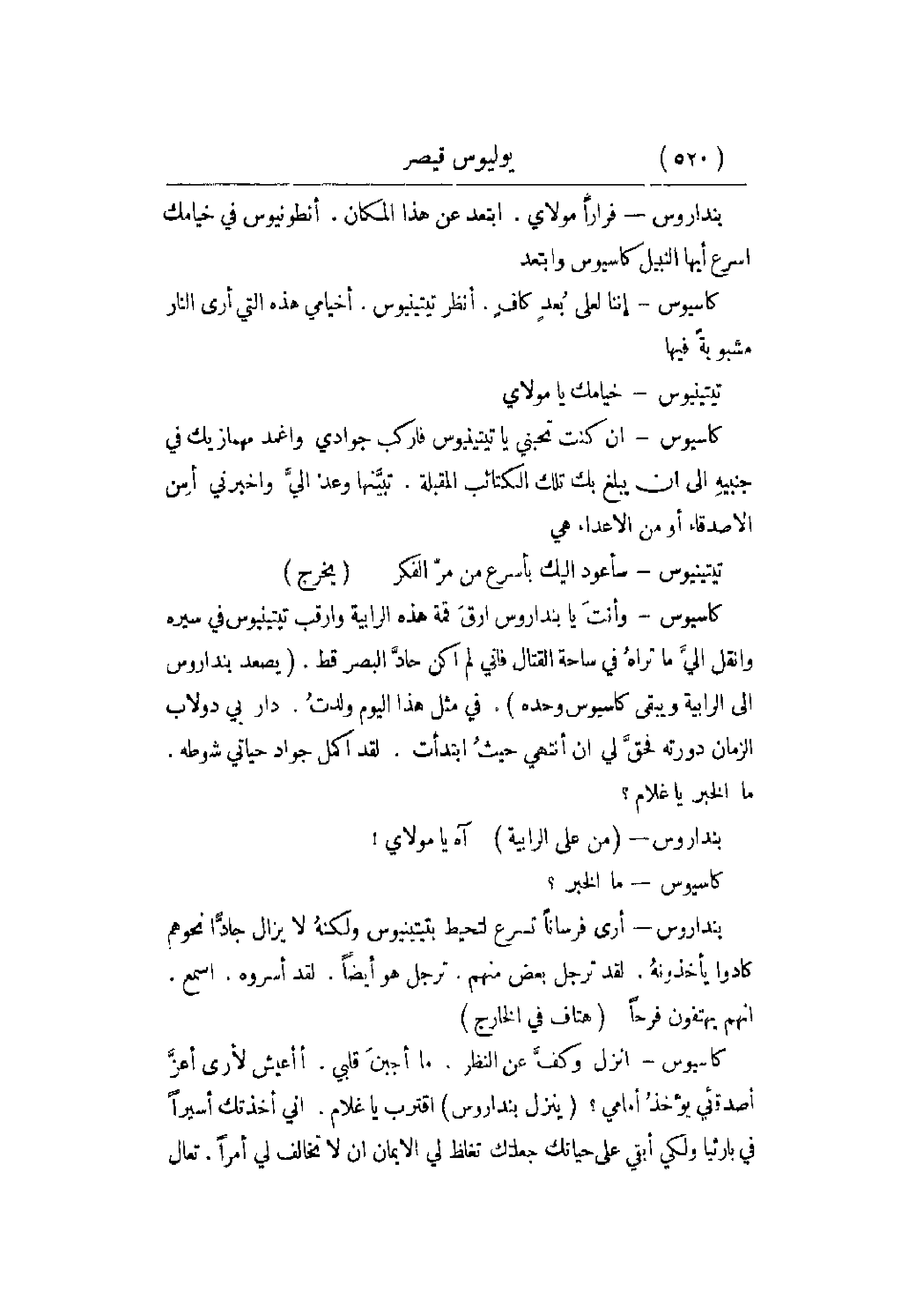 كاسيوس - وأنتَ يا بنداروس أرقَ قمة هذه الرابية وارقب تيتينيوس في سيره وانقل إليَّ ما تراهُ في ساحة القتال فإني لم أكن حادَّ البصر قط. يصعد بنداروس إلى الرابية ويبقى كاسيوس وحده في مثل هذا اليوم ولدتُ. دار بي دولاب الزمان دورته فحقَّ لي أن أنتهي حيثُ ابتدأتز لقد أكمل جواد حياتي شوطه. ما الخبر يا غلام؟