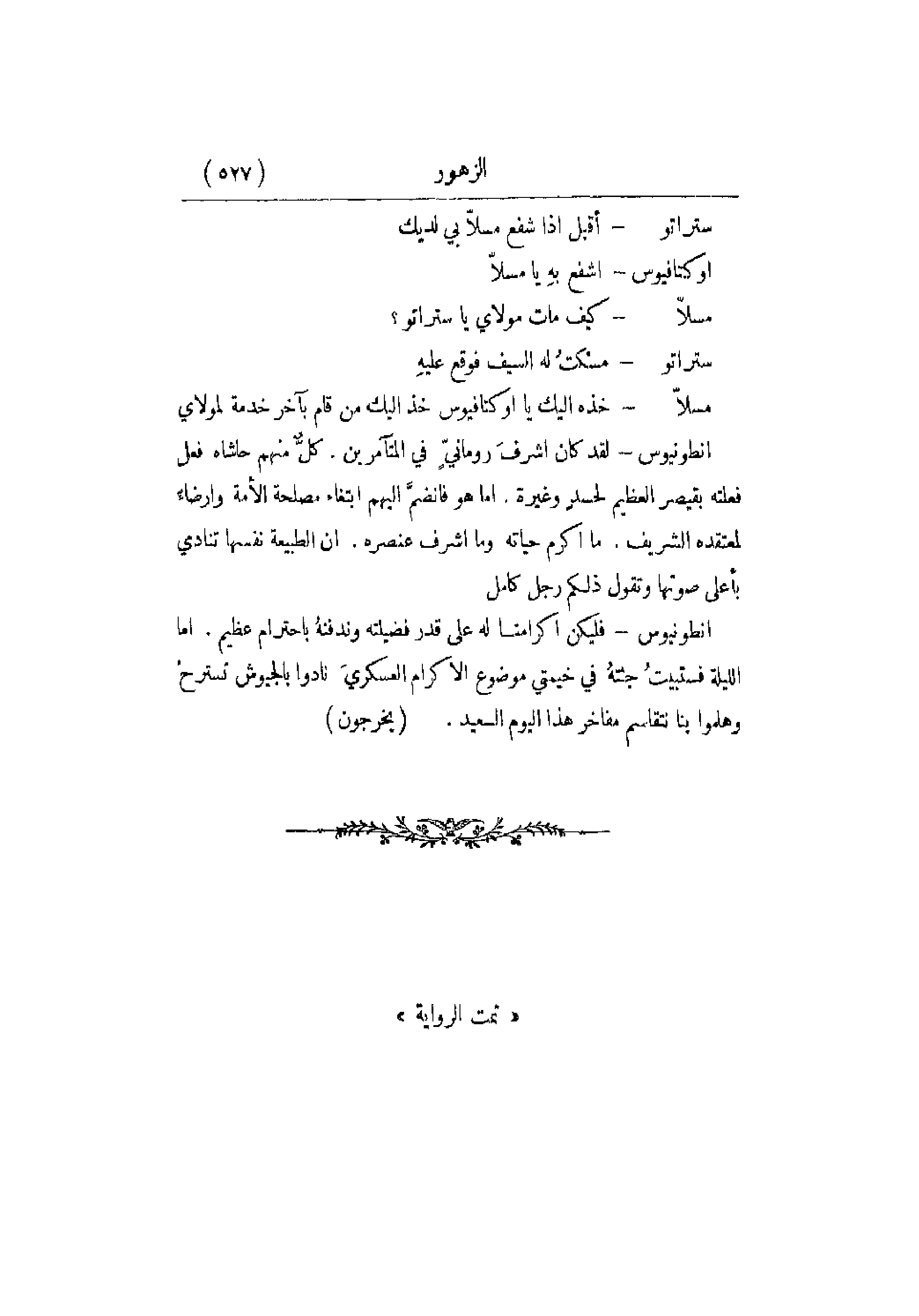 أنطونيوس - فليكن إكرامنا له على قدر فضيلته وندفنهُ باحترام عظيم. أما الليلة فستبيتُ جثتهُ في خيمتي موضوع الإكرام العسكريَ نادوا بالجيوش تسترحْ وهلموا بنا نتقاسم مفاخر هذا اليوم السعيد يخرجون