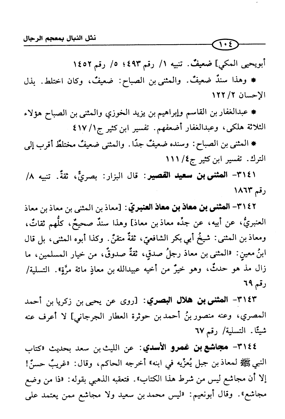 3142 - المثنى بن معاذ بن معاذ العنبريّ: [معاذ بن المثنى بن معاذ بن معاذ العنبريُّ، عن أبيه، عن جدِّه معاذ بن معاذ] وهذا سندٌ صحيحٌ، كلُّهم ثقاتٌ، ومعاذ بن المثنى: شيخُ أبي بكر الشافعيّ، ثقةٌ متقنٌ. وكذا أبوه المثنى، بل قال ابنُ معينٍ: "المثنى بن معاذ رجلُ صدقٍ , ثقةٌ صدوقٌ، من خيار المسلمين، ما زال مذ هو حدثٌ، وهو خيرٌ من أخيه عبيد الله بن معاذٍ مائة مرَّةٍ". التسلية/ رقم 69