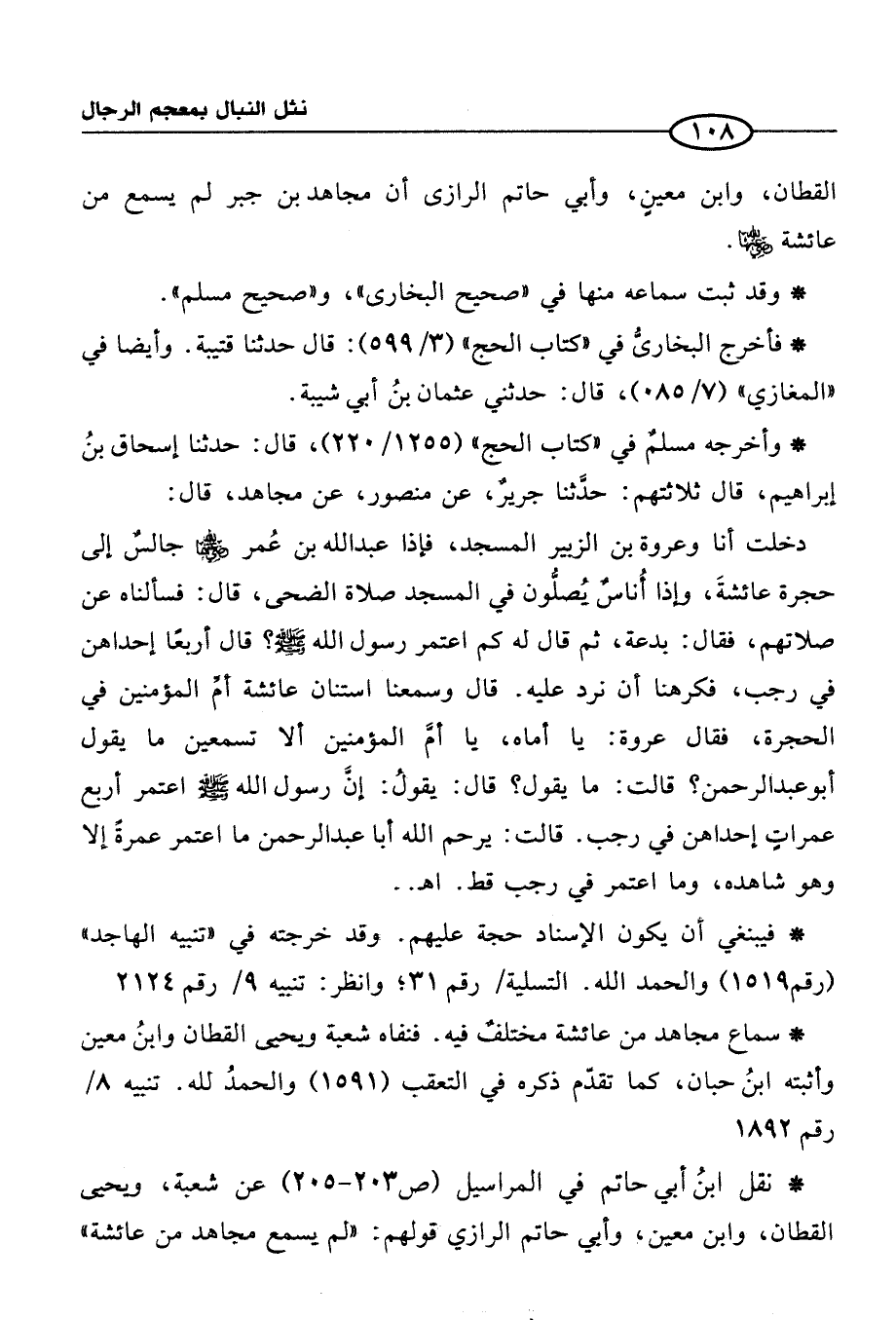 * سماع مجاهد من عائشة مختلفٌ فيه. فنفاه شعية ويحيى القطان وابنُ معين وأثبته ابنُ حبان، كما تقدّم ذكره في التعقب (1591) والحمدُ لله. تنبيه 8/ رقم 1892