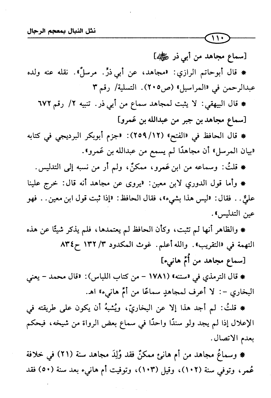 * وسماعُ مجاهد من أم هانئ ممكنٌ فقد وُلِدَ مجاهد سنة (21) في خلافة عُمر، وتوفي سنة (102)، وقيل (103)، وتوفيت أم هانيء بعد سنة (50) فقد