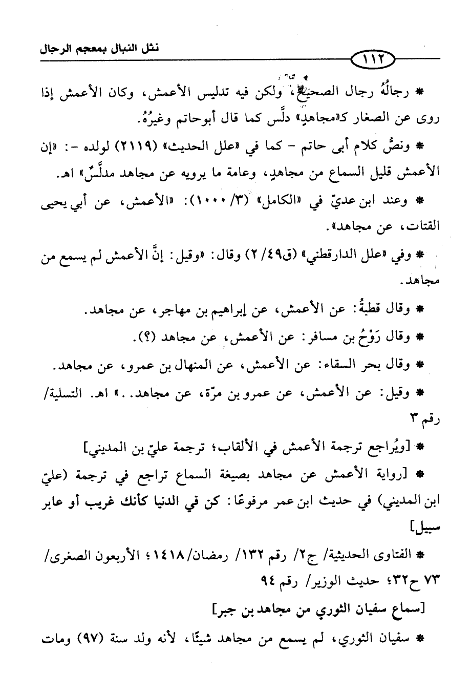 * [رواية الأعمش عن مجاهد بصيغة السماع تراجع في ترجمة (عليّ ابن المديني) في حديث ابن عمر مرفوعًا: كن في الدنيا كأنك غريب أو عابر سبيل]