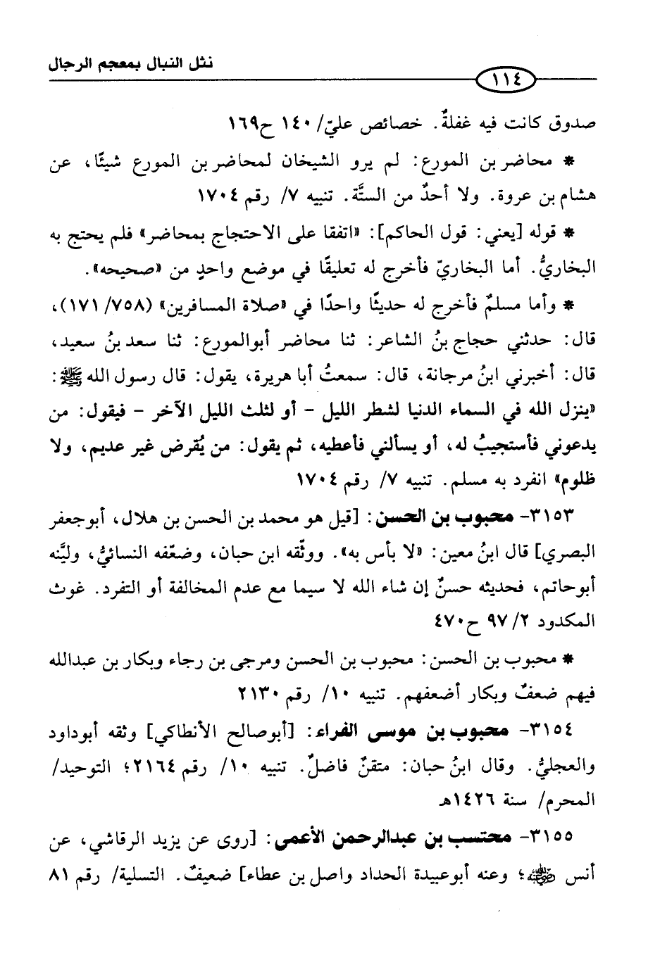 * محبوب بن الحسن: محبوب بن الحسن ومرجى بن رجاء وبكار بن عبد الله فيهم ضعفٌ وبكار أضعفهم. تنبيه 10/ رقم 2130