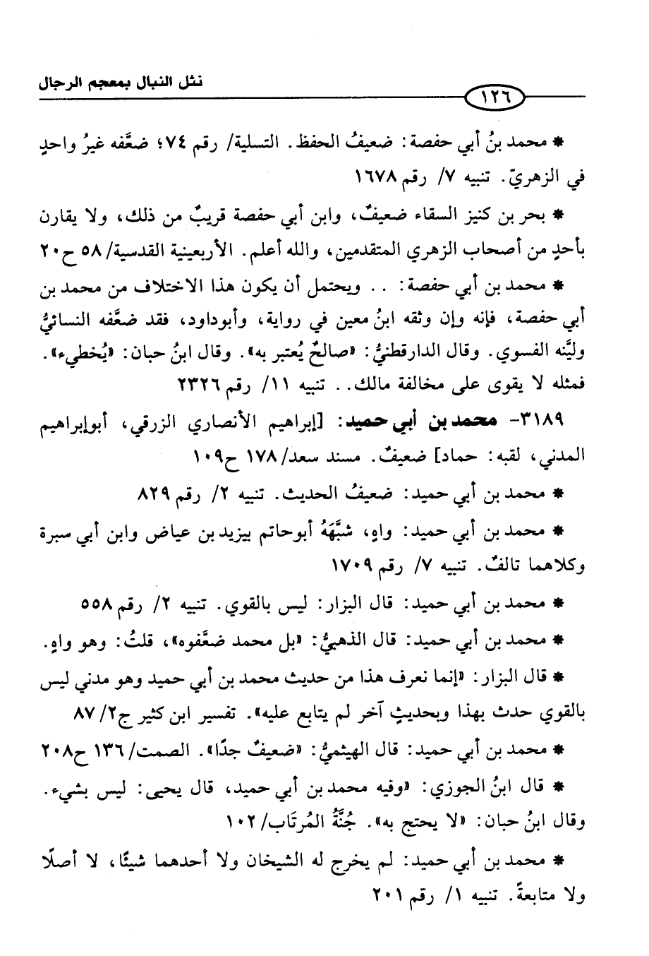 * محمد بن أبي حفصة:. . ويحتمل أن يكون هذا الاختلاف من محمد بن أبي حفصة، فإنه وإن وثقه ابنُ معين في رواية, وأبو داود، فقد ضعَّفه النسائيُّ وليَّنه الفسوي. وقال الدارقطنيُّ: "صالحٌ يُعتبر به". وقال ابنُ حبان: "يُخطيء". فمثله لا يقوى على مخالفة مالك. . تنبيه 11/ رقم 2326