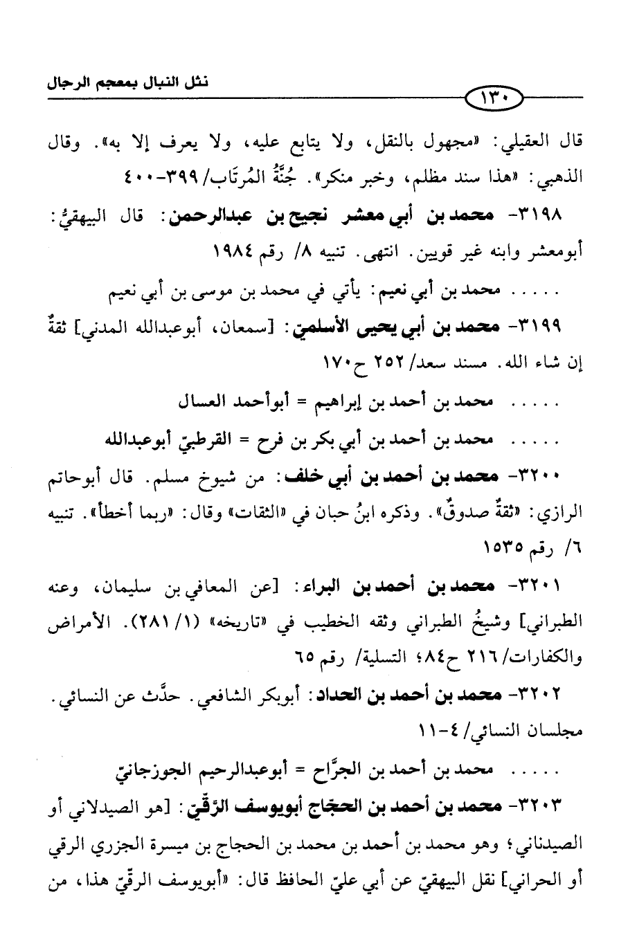 3203 - محمد بن أحمد بن الحجّاج أبو يوسف الرَّقّيّ: [هو الصيدلاني أو الصيدناني؛ وهو محمد بن أحمد بن محمد بن الحجاج بن ميسرة الجزري الرقي أو الحراني] نقل البيهقيّ عن أبي عليّ الحافظ قال: "أبو يوسف الرقّيّ هذا، من