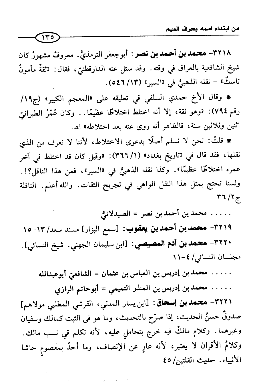 3221 - محمد بن إسحاق: [ابن يسار المدني، القرشي المطلبي مولاهم] صدوقٌ حسنُ الحديث، إذا صرّح بالتحديث، وما هو في الثبت كمالك وسفيان وغيرهما. وكلام مالكٌ فيه خرج بتحاملٍ عليه, لأنه تكلم في نسب مالك. وكلامُ الأقران لا يعتبر, لأنه عارٍ عن الإنصاف، وما أحدٌ بمعصومٍ حاشا الأنبياء. حديث القلتين / 45