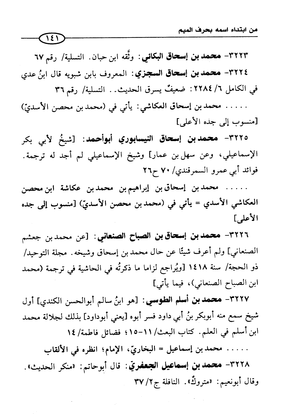 3226 - محمد بن إسحاق بن الصباح الصنعاني: [عن محمَّد بن جعشم الصنعاني] ولم أعرف شيئًا عن حال محمَّد بن إسحاق وشيخه. مجلة التوحيد / ذو الحجة/ سنة 1418 [ويُراجع لزاما ما ذكرتُه في الحاشية في ترجمة (محمَّد ابن الصباح الصنعاني)، فيما يأتي]