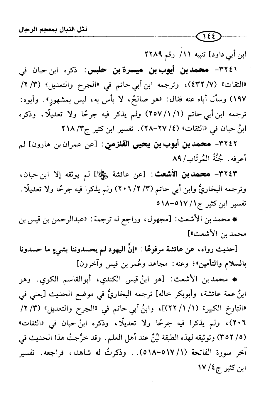 3243 - محمد بن الأشعث: [عن عائشة رضي الله عنها] لم يوثقه إلا ابن حبان، وترجمه البخاريُّ وابن أبي حاتم (3/ 2/ 206) ولم يذكرا فيه جرحًا ولا تعديلًا. تفسير ابن كثير ج1/ 517 - 518