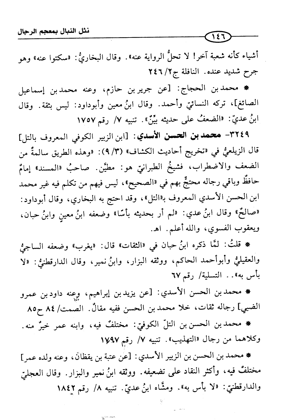 3249 - محمَّد بن الحسن الأسدي: [ابن الزبير الكوفي المعروف بالتل] قال الزيلعيُّ في "تخريج أحاديث الكشاف" (3/ 9): "وهذه الطريق سالمةٌ من الضعف والاضطراب، فشيخُ الطبرانيّ هو: مطيَّن. صاحبُ "المسند" إمامٌ حافظٌ وباقي رجاله محتجٌّ بهم في "الصحيح"، ليس فيهم من تكلم فيه غير محمَّد ابن الحسن الأسدي المعروف بـ"التل"، وقد احتج به البخاري، وقال أبو داود: "صالحٌ" وقال ابنُ عدي: "لم أر بحديثه بأسًا" وضعفه ابنُ معينٍ وابنُ حبان، ويعقوب الفسوي، والله أعلم. اهـ.