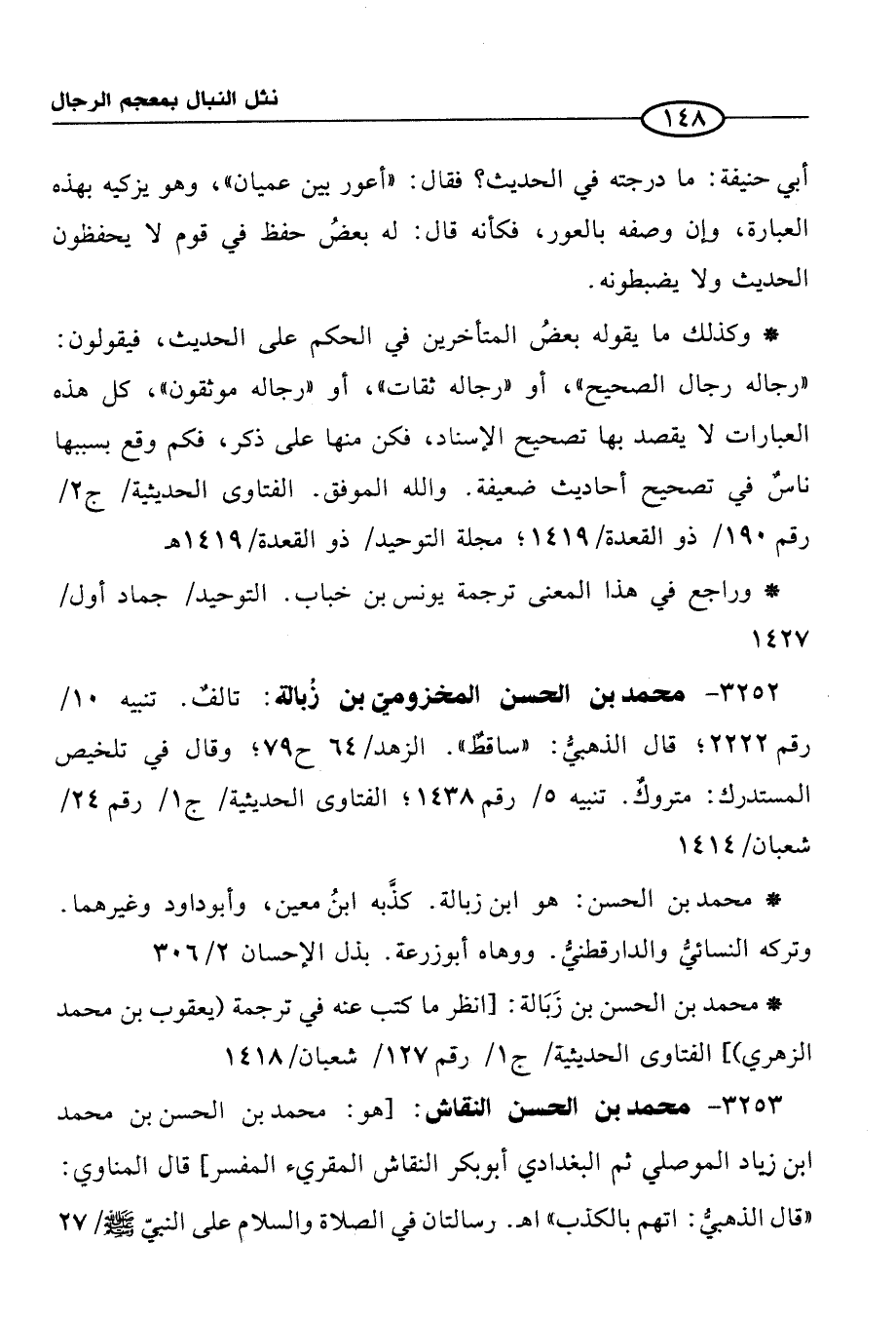3253 - محمد بن الحسن النقاش: [هو: محمد بن الحسن بن محمَّد ابن زياد الموصلي ثم البغدادي أبو بكر النقاش المقريء المفسر] قال المناوي: "قال الذهبيُّ: اتهم بالكذب" اهـ. رسالتان في الصلاة والسلام على النبيّ -صلى الله عليه وسلم- / 27