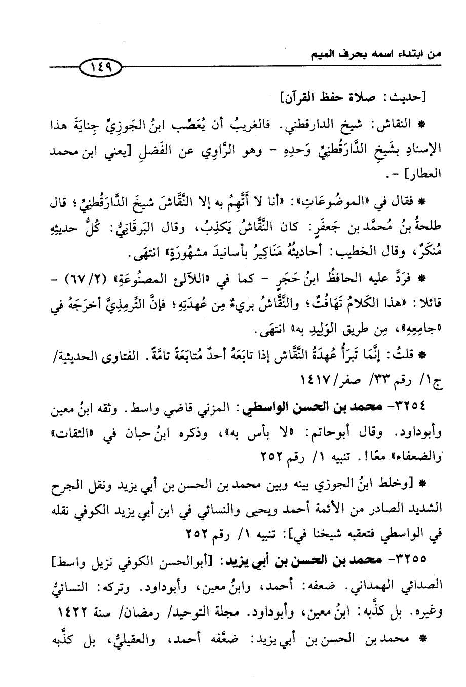 * [وخلط ابنُ الجوزي بينه وبين محمَّد بن الحسن بن أبي يزيد ونقل الجرح الشديد الصادر من الأئمة أحمد ويحيى والنسائي في ابن أبي يزيد الكوفي نقله في الواسطي فتعقبه شيخنا في]: تنبيه 1/ رقم 252