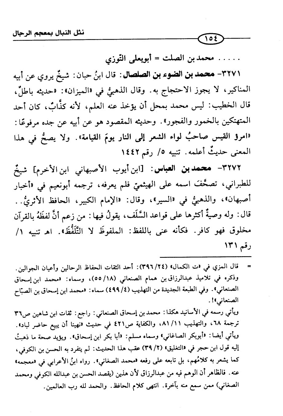 3272 - محمَّد بن العباس: [ابن أيوب الأصبهاني ابن الأخرم] شيخٌ للطبراني، تصحَّفَ اسمه على الهيثميّ فلم يعرفه، ترجمه أبو نعيم في "أخبار أصبهان"، والذهبيُّ في "السير"، وقال: "الإِمام الكبير، الحافظ الأثريُّ. . قال: وله وصيةٌ أكثرها على قواعد السَّلَف، يقولُ فيها: من زعم أنَّ لفظَهُ بالقرآن مخلوق فهو كافر. فكأنة عنى باللفظ: الملفوظَ لا التلَفُّظَ". اهـ تنبيه 1/ رقم 131