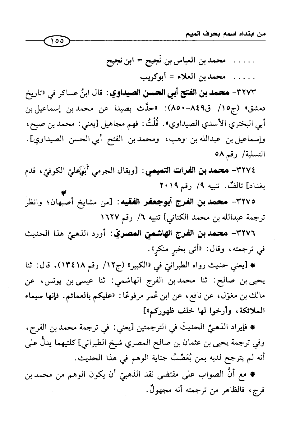 3273 - محمَّد بن الفتح أبي الحسن الصيداوي: قال ابنُ عساكر في "تاريخ دمشق" (ج15/ ق 849 - 850): "حدَّث بصيدا عن محمد بن إسماعيل بن أبي البختري الأسدي الصيداوي". قُلْتُ: فهم مجاهيل [يعني: محمَّد بن صبح، وإسماعيل بن عبد الله بن وهب، ومحمد بن الفتح أبي الحسن الصيداوي]. التسلية / رقم 58
