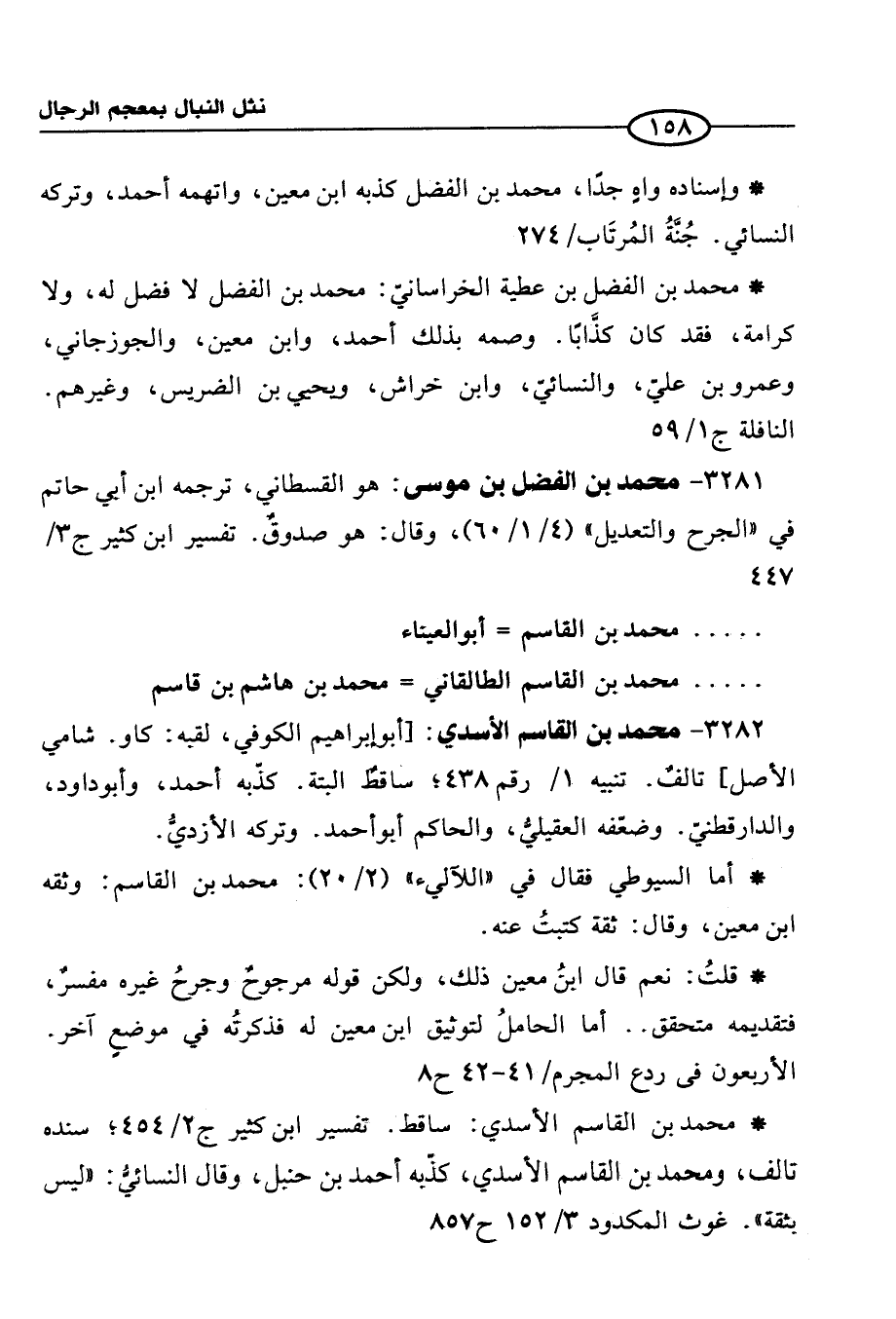 * محمَّد بن الفضل بن عطية الخراسانيّ: محمَّد بن الفضل لا فضل له، ولا كرامة، فقد كان كذَّابًا. وصمه بذلك أحمد، وابن معين، والجوزجاني، وعمرو بن عليّ، والنسائيّ، وابن خراش، ويحيي بن الضريس، وغيرهم. النافلة ج1/ 59