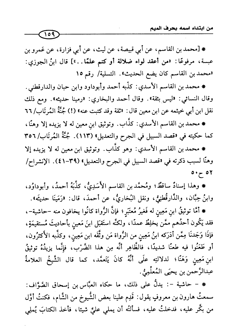 * محمَّد بن القاسم الأسدي: كذّبه أحمد وأبو داود وابن حبان والدارقطني. وقال النسائي: "ليس بثقة" وقال أحمد والبخاري: "رمينا حديثه". ومع ذلك نقل ابن أبي خيثمة عن ابن معين قال: "ثقة وقد كتبت عنه" (!) جُنَّةُ المُرتَاب / 66